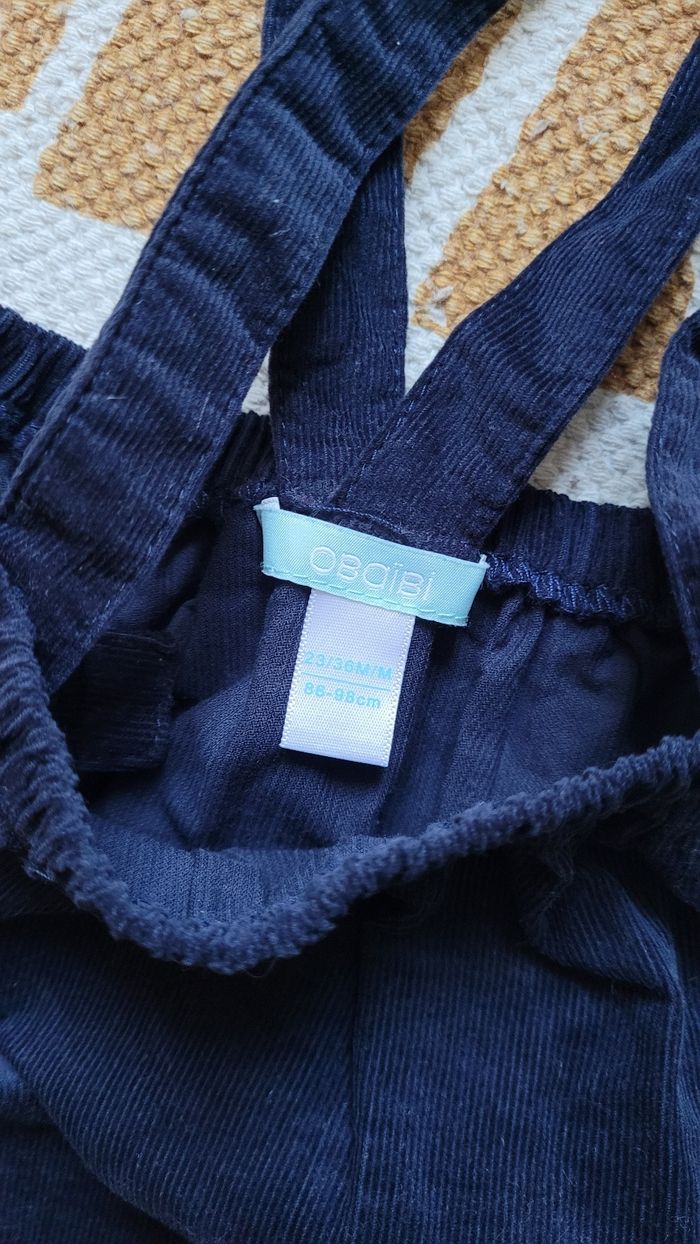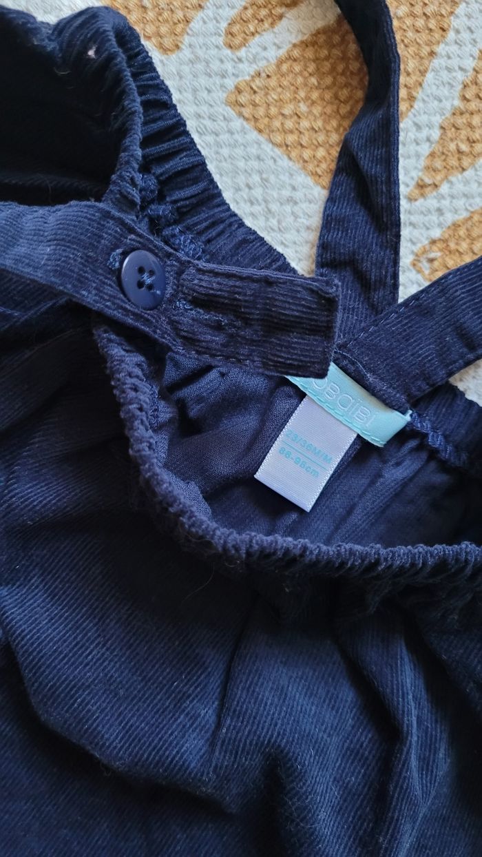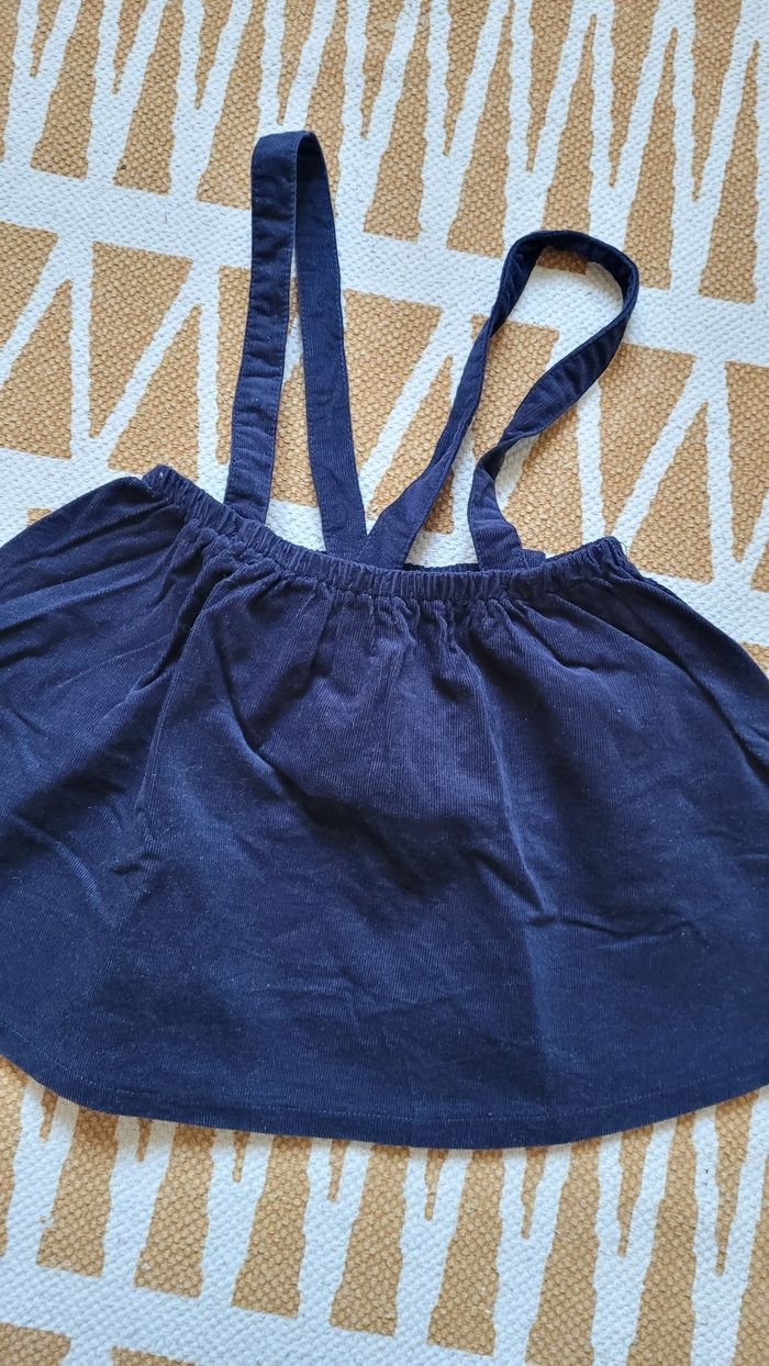 Jupe velour bleue marine 23.36mois. 86.98cm. Avec bretelles 2 tailles, non amovibles. Il me semble qu'elle est neuve.