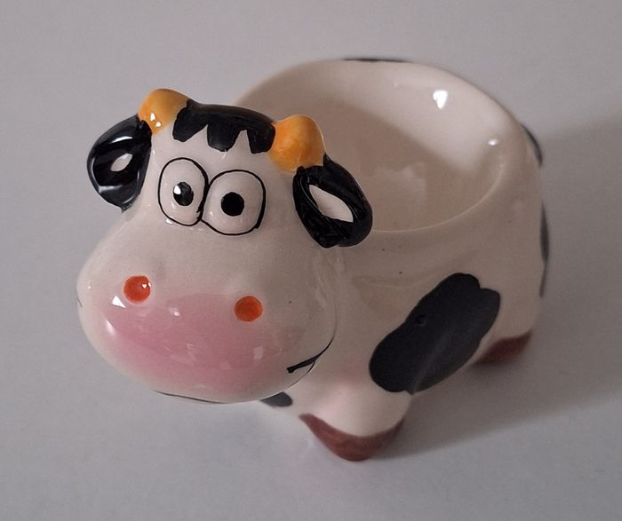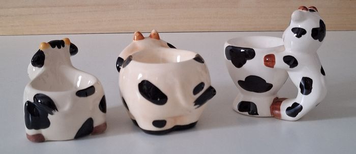Trois mignons coquetiers "vache" en céramique en très bon état. Le plus grand a un tout petit éclat en dessous.