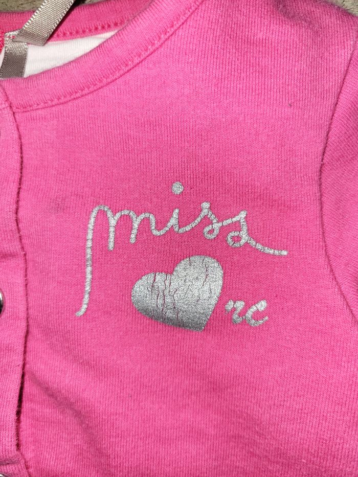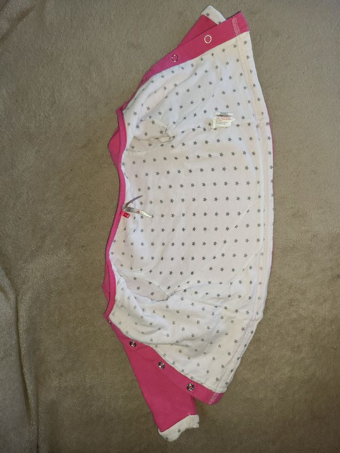 Gilet rose fuschia Orchestra A pressions Intérieur blanc motif étoiles ainsi que le revers des manches Petites poches en forme de noeuds Bien porté Une tâche à côté du M Taille grand #virgy61fille6mois #virgy61fille9mois