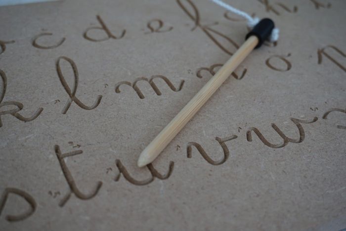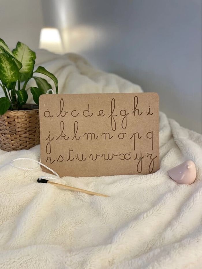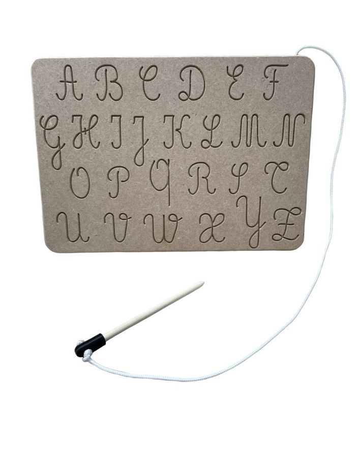 Cette planche de traçage en bois est un excellent outil d'apprentissage inspiré par la méthode Montessori. Cette tablette d'écriture en bois est un matériel innovant pour apprendre à écrire en lettres cursives avec la méthode Montessori. Avec une conception en bois naturel, robuste et durable, cette tablette est conçue spécifiquement pour aider les enfants à apprendre à écrire et à prendre conscience de leur propre apprentissage. Cette tablette de traçage en bois est idéale pour apprendre à écrire en lettre cursive de manière ludique et intuitive. Conçue selon la méthode Montessori, elle offre une expérience ludique et amusante pour les enfants afin qu'ils apprennent à tracer les lettres. Cette tablette est spécifiquement conçue pour aider les enfants à acquérir la précision et la maitrise de l'écriture. L'enfant se réfère aux flèches et aux numéros gravés afin de déterminer le sens de traçage de la lettre, cette façon de faire permet un apprentissage de l'écriture plus autonome. [Recto/Verso] 1 face : Minuscules Cursives