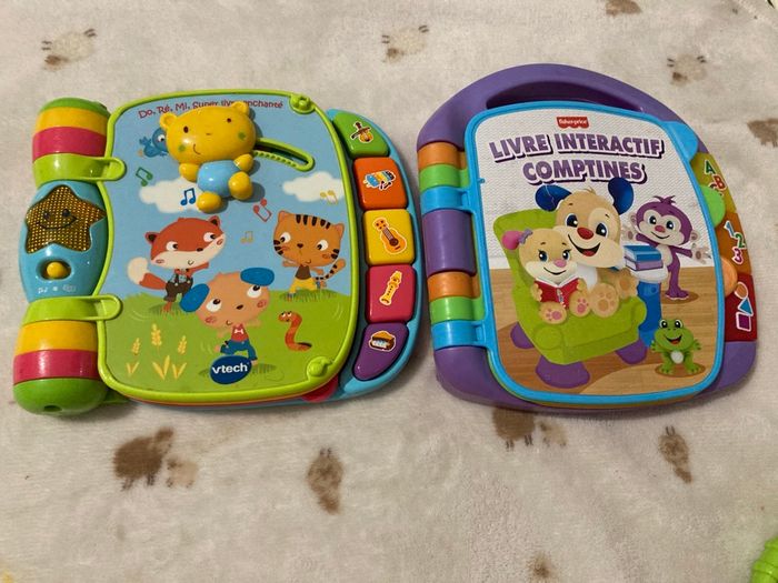 Lot de 3 jouets musicaux : 2 livres musiques comptines Vtech et Fisher Price + un tambourin musical pour le tambourin musical il es comme neuf peu utilisé. Lot en tres bon etat les livres ne présente aucun trace de feutre ou autre. Piles fournies dans tambourin et livre Vtech le Fisher Price sans piles.