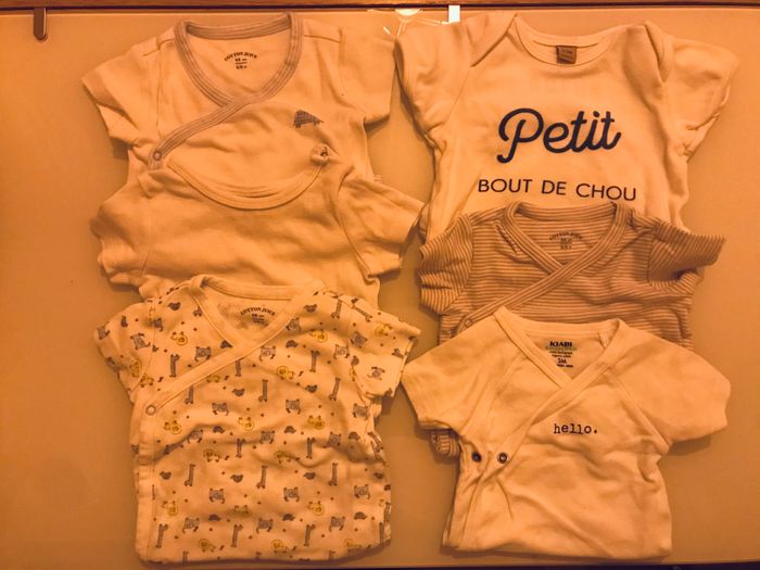 6 bodies en coton manches courtes : - 2 passage tête (blanc uni H&M / blanc écriture « Petit Bout de Chou ») - 4 ouverture devant (rayés gris / blanc écriture « hello. » / blanc finitions rayures bleues / blanc motifs animaux jaunes - gris - bleus)