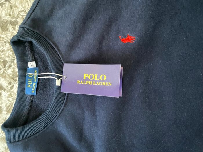 Pull Polo Ralph Lauren bleu marine, logo brodé rouge sur la poitrine.