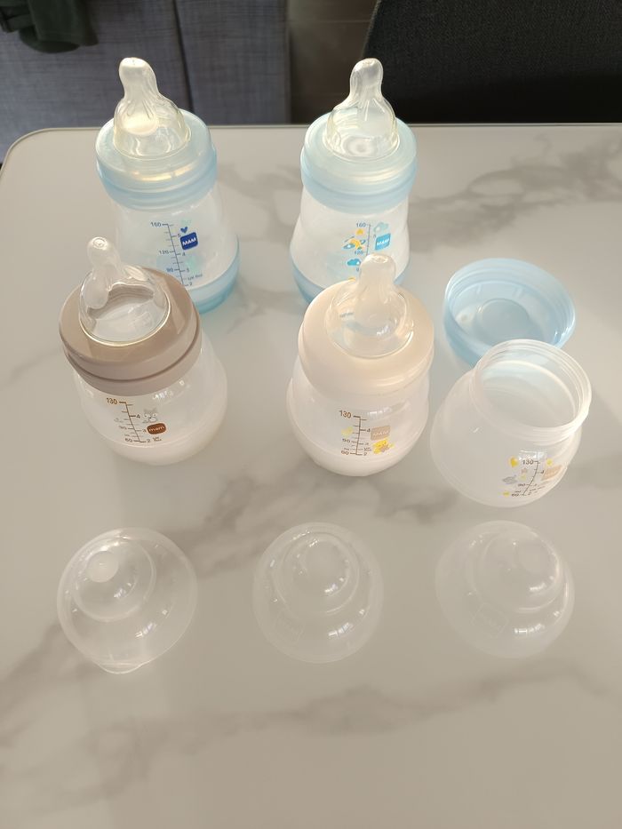 Lot de 4 biberons de marque mam en très bon état ; 2 biberons de 130 avec 2 tétines 0 et 2 biberons de 160 avec 2 tétines 1. En plus, 1 biberon de 130 sans tétine. Prix du lot : 6€.