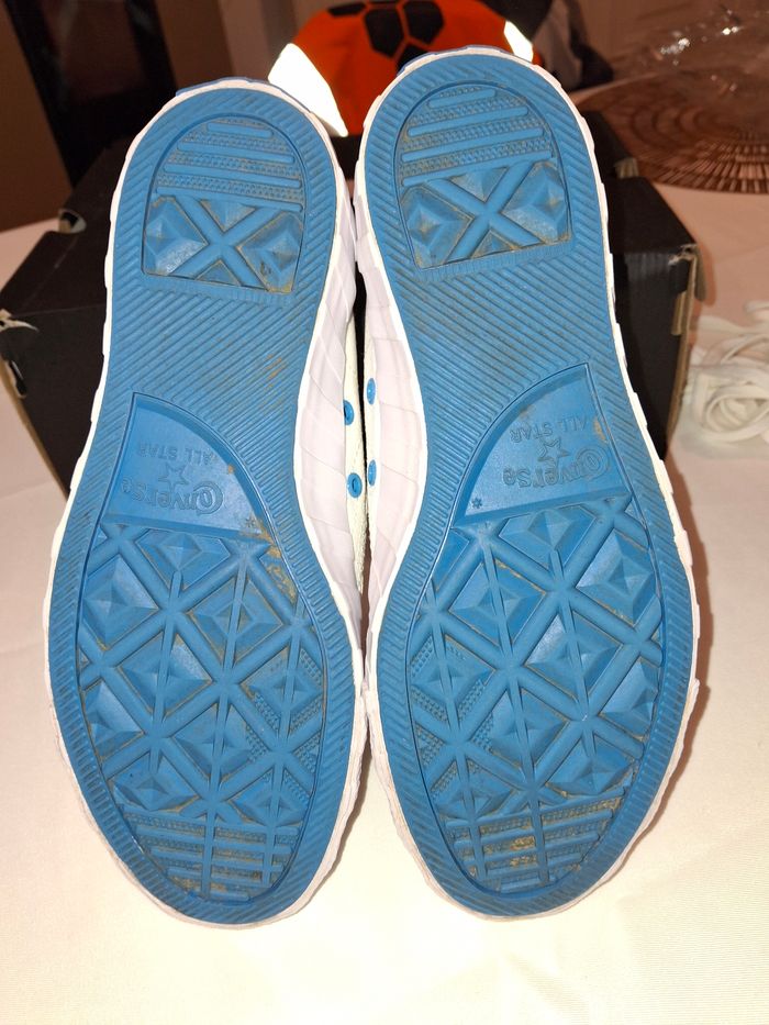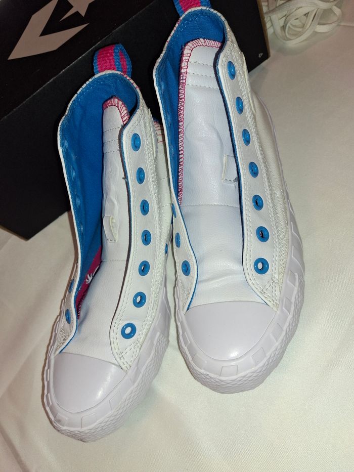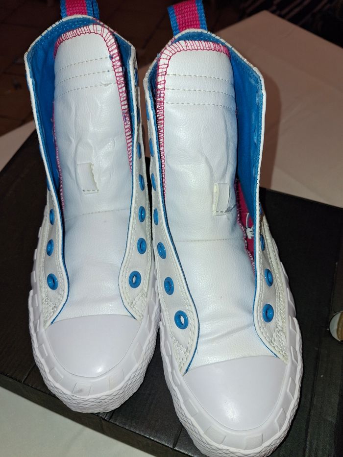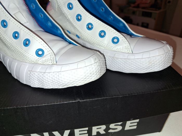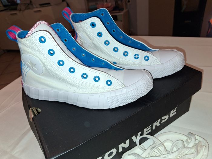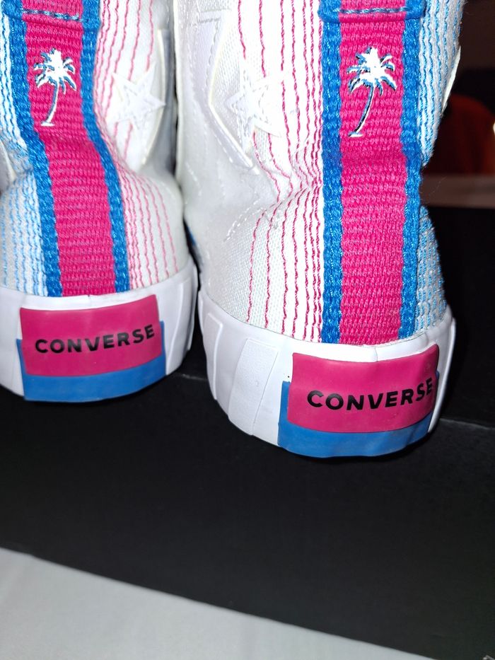 Magnifique Converse Modèle Miami Taille 38.5 En bon état Lacets fournis Blanches avec petits dessins rose et bleu derrière et étoiles blanches sur le côté