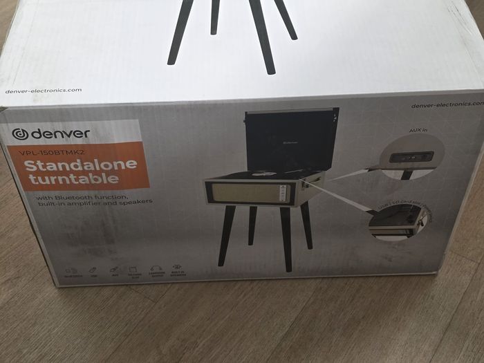 Platine vinyle Denver VPL-150BT MK2, modèle autonome sur pieds, au design rétro type meuble, neuve (boîte d’origine, jamais utilisée).