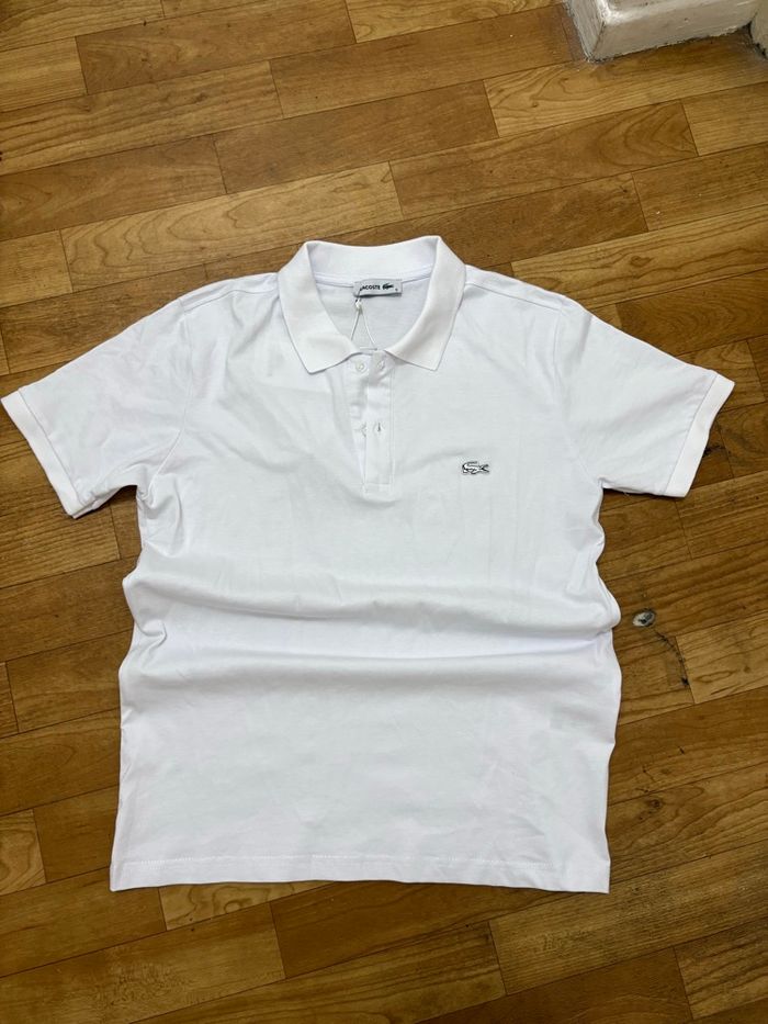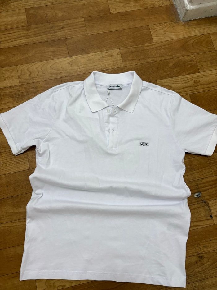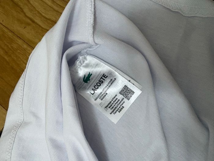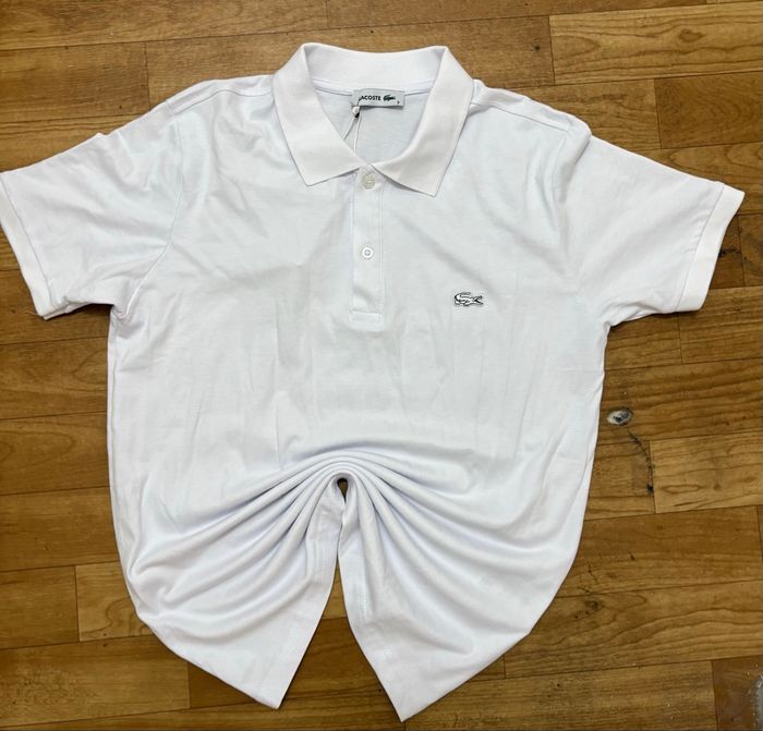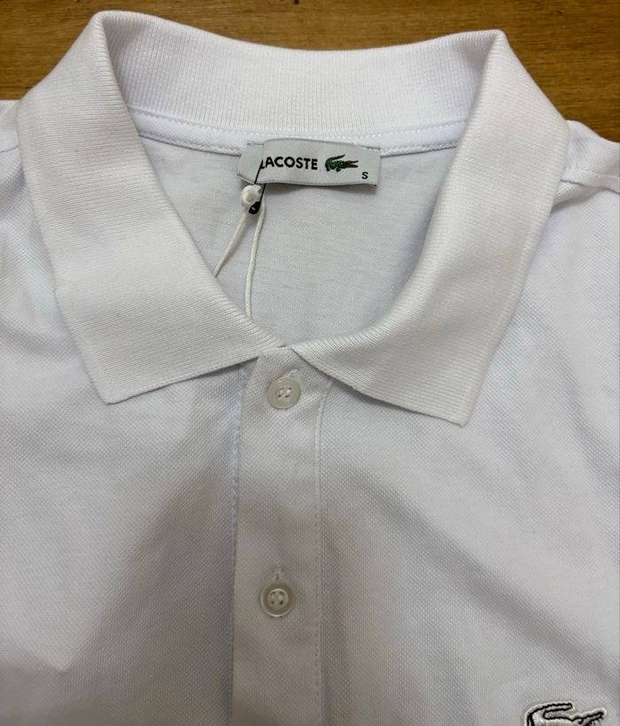 classic white Lacoste polo shirt crafted from soft, breathable cotton piqué fabric. It features a ribbed polo collar with a two-button placket and short sleeves for a clean, timeless look. The iconic embroidered Lacoste crocodile logo is positioned on the left chest.