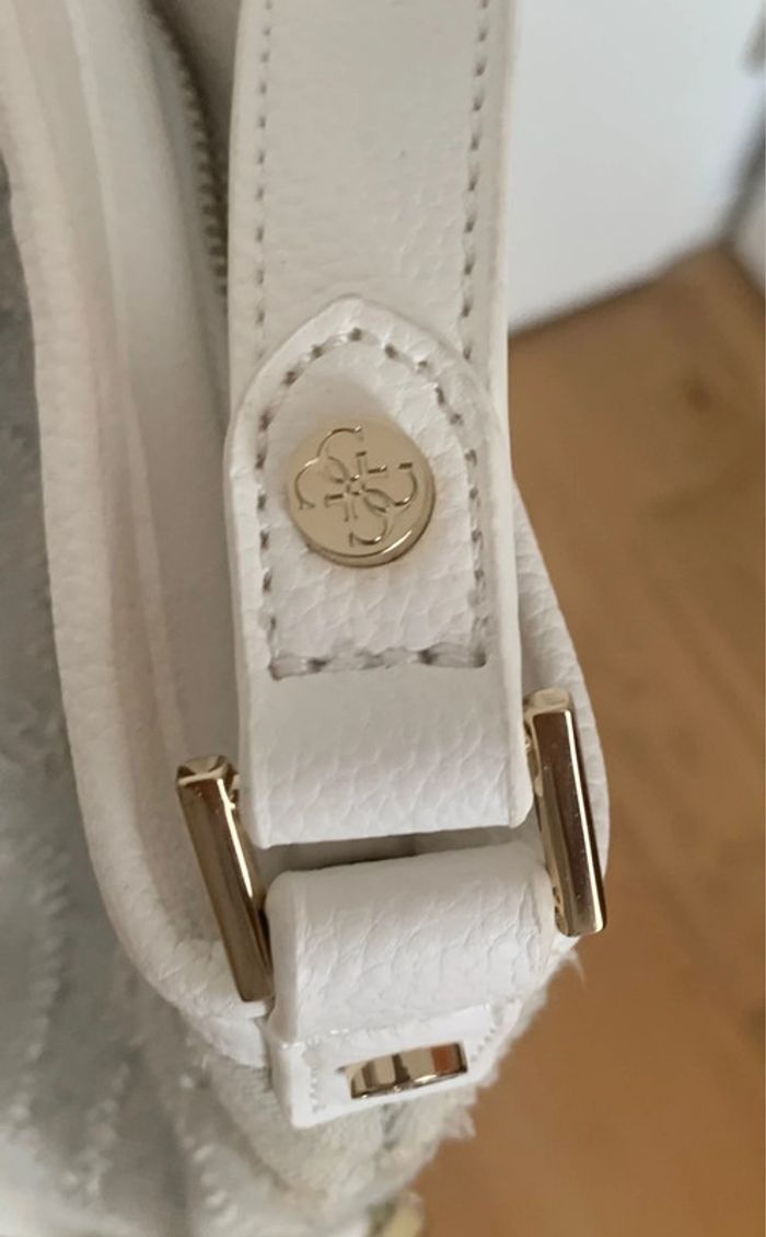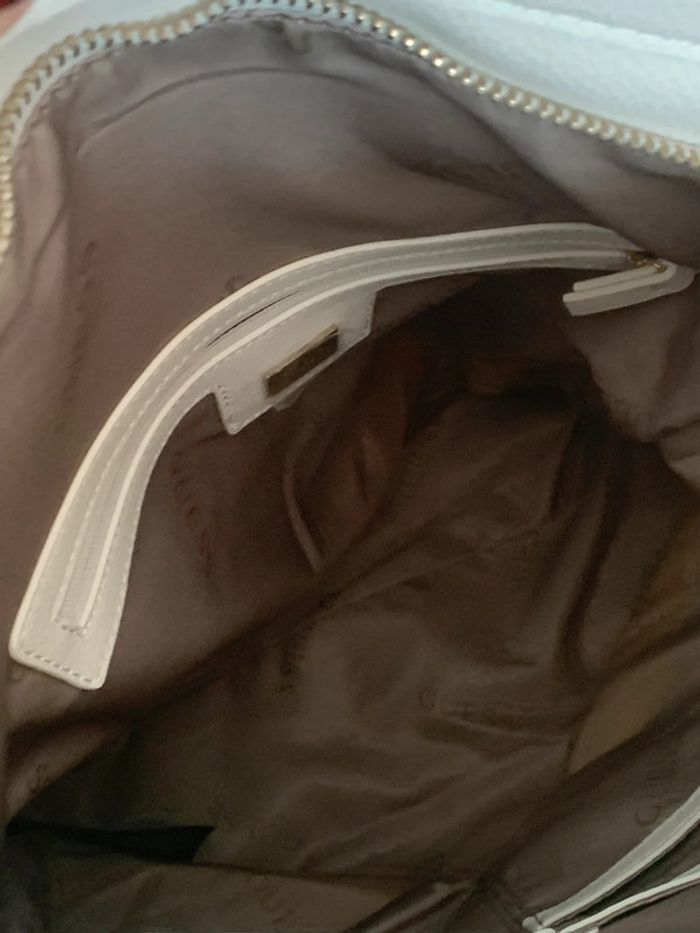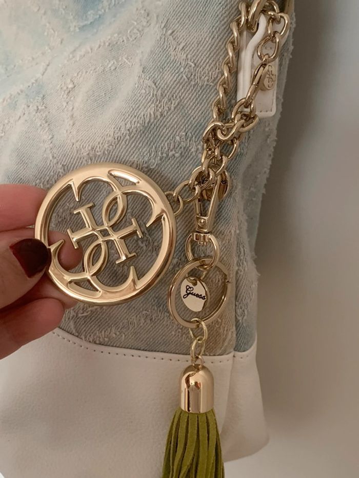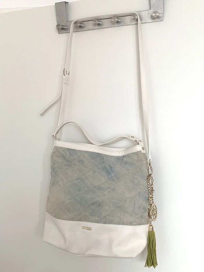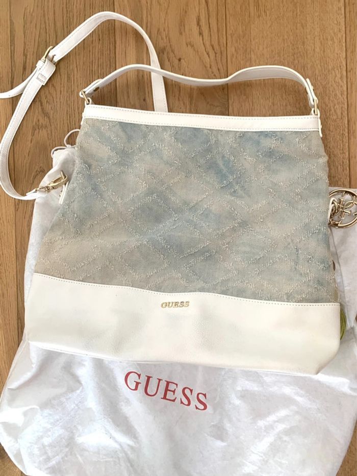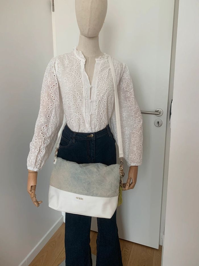 Sac en similicuir blanc et textile texturé, de couleur bleu denim effet used (décoloré/usé/sali). Les irrégularités et taches sont voulues et normales. Ouverture sur le haut du sac avec zip. Bijou de sac avec pompon. Anse pour porté main et bandoulière amovible. Dimensions : 49x36x13 cm. Jamais utilisé avec dustbag. #cristolieaccessoires