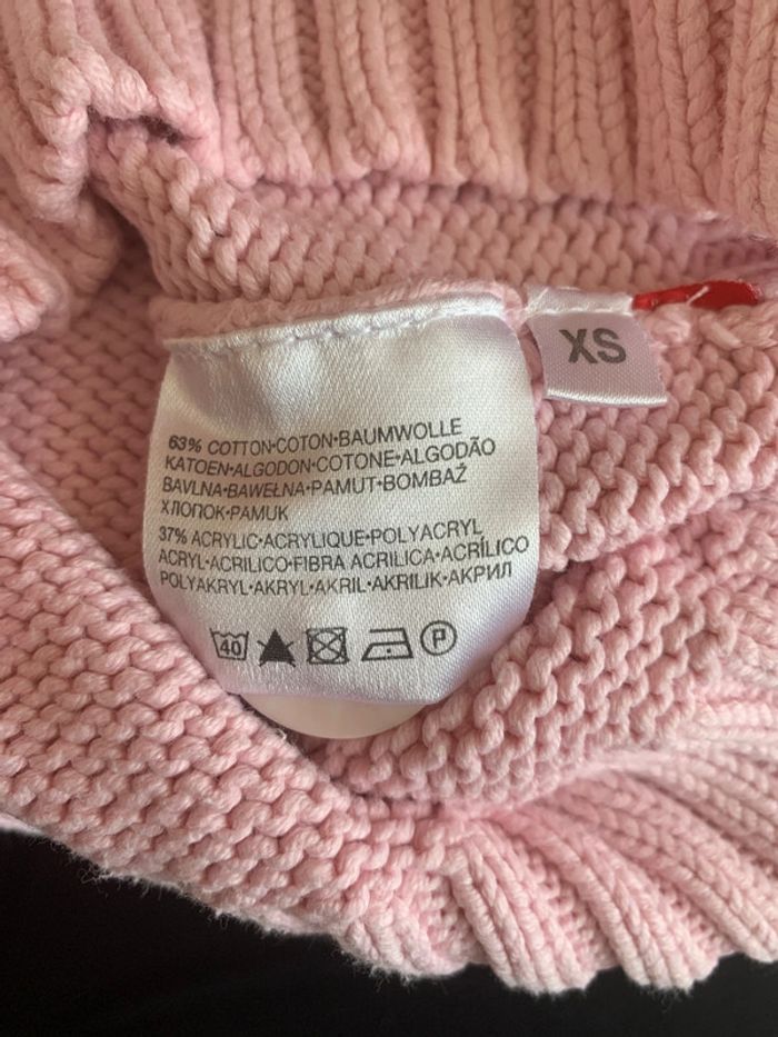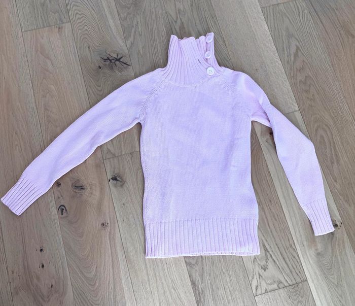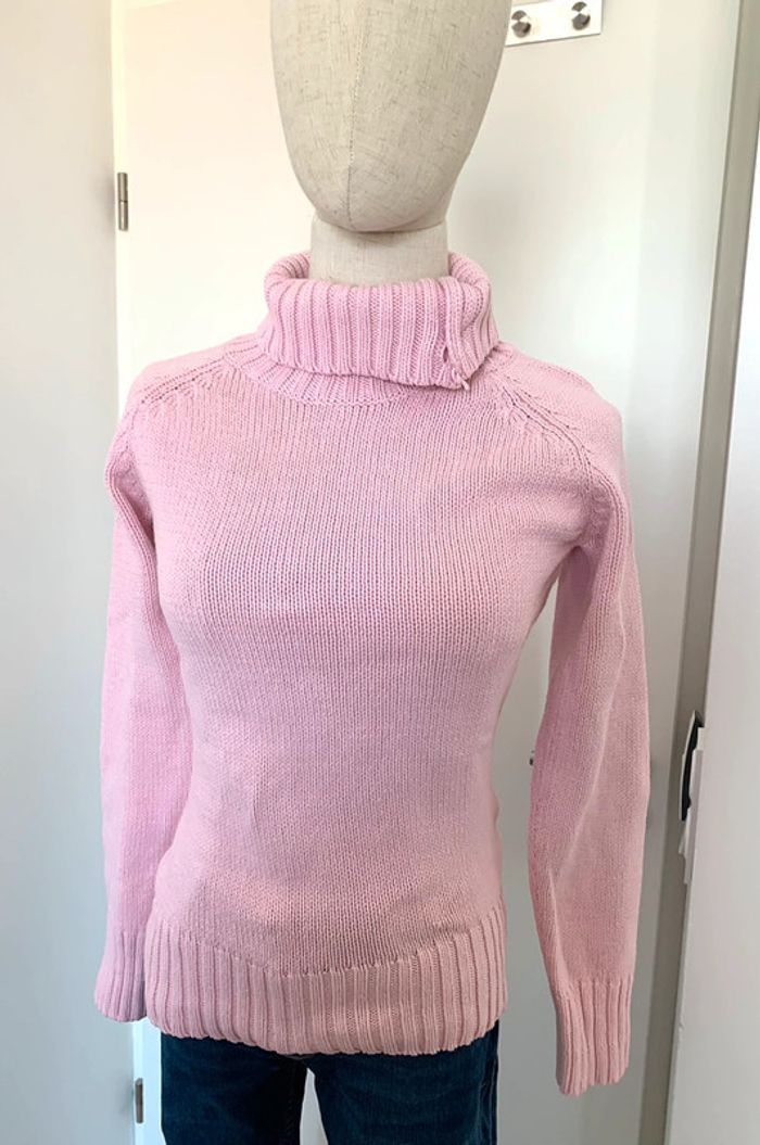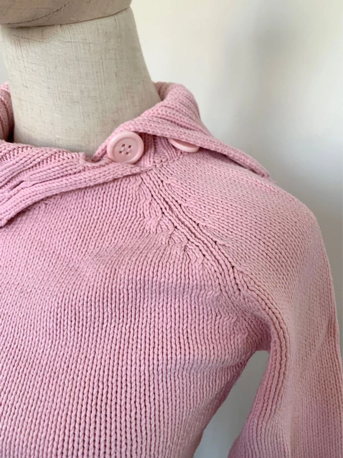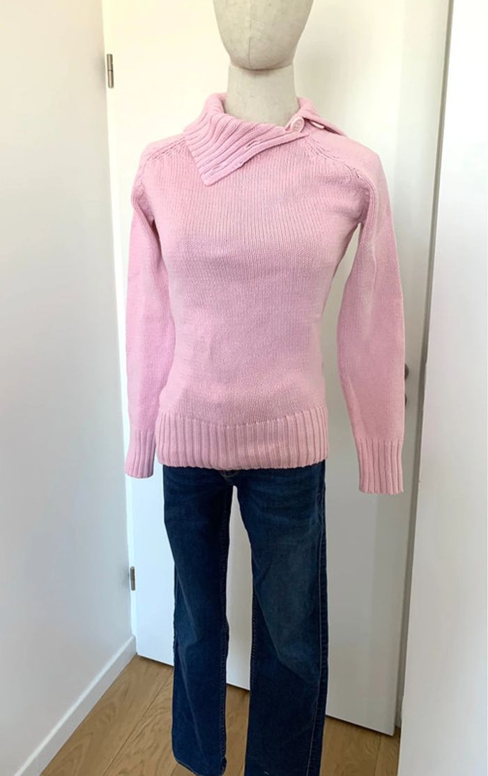 Pull Yessica C&A en grosse maille, coupe droite ajustée, col montant avec gros bouton côté pour l’ouvrir. Coton 63% acrylique 37%. Coloré rose. Taille XS (34/36). Largeur à plat sous aisselles : 39 cm. Longueur 60 cm. Peu porté. #cristolie36 #cristolie34