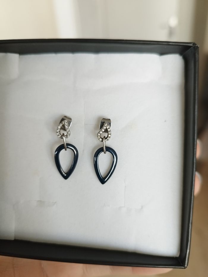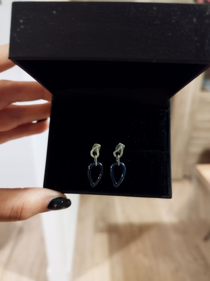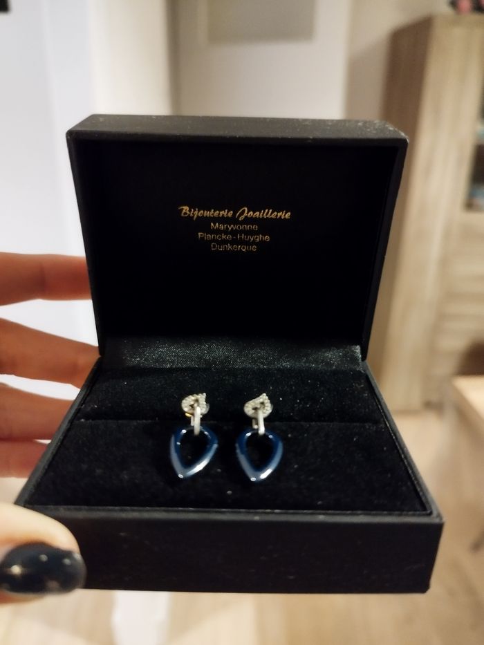 Vends boucles d'oreilles femme acheté à Cléor, en très bon état ! Couleur argent et bleu foncé. La pierre est inoxydable. Je l'avais acheté exprès car je travaillais dans un endroit humide. Très élégante.