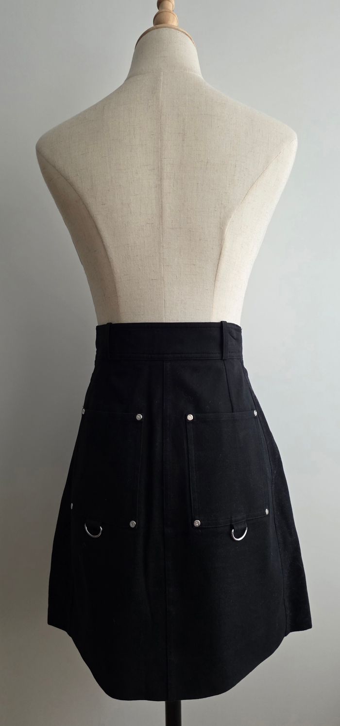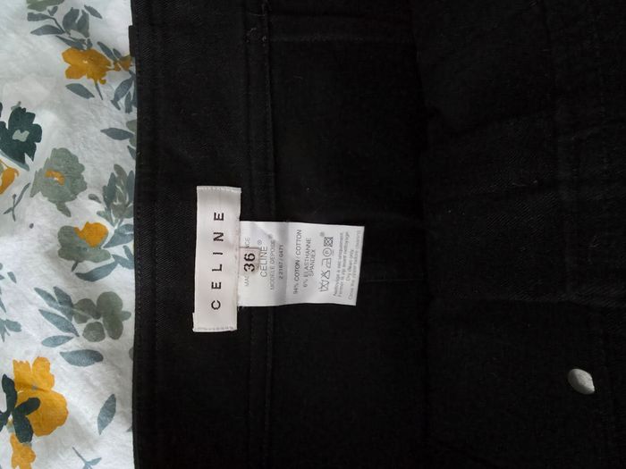 Jupe de marque Celine, taille 36, 94% coton, 6% élasthanne. Couleur noir, 2 poches avant, 2 poches arrière, passant pour ceinture, accessoires déco. Mesure taille: 41cm Longueur: 46cm