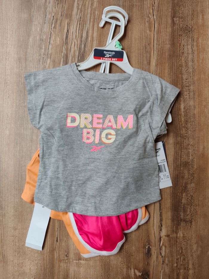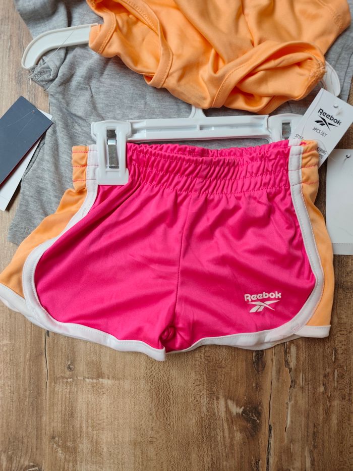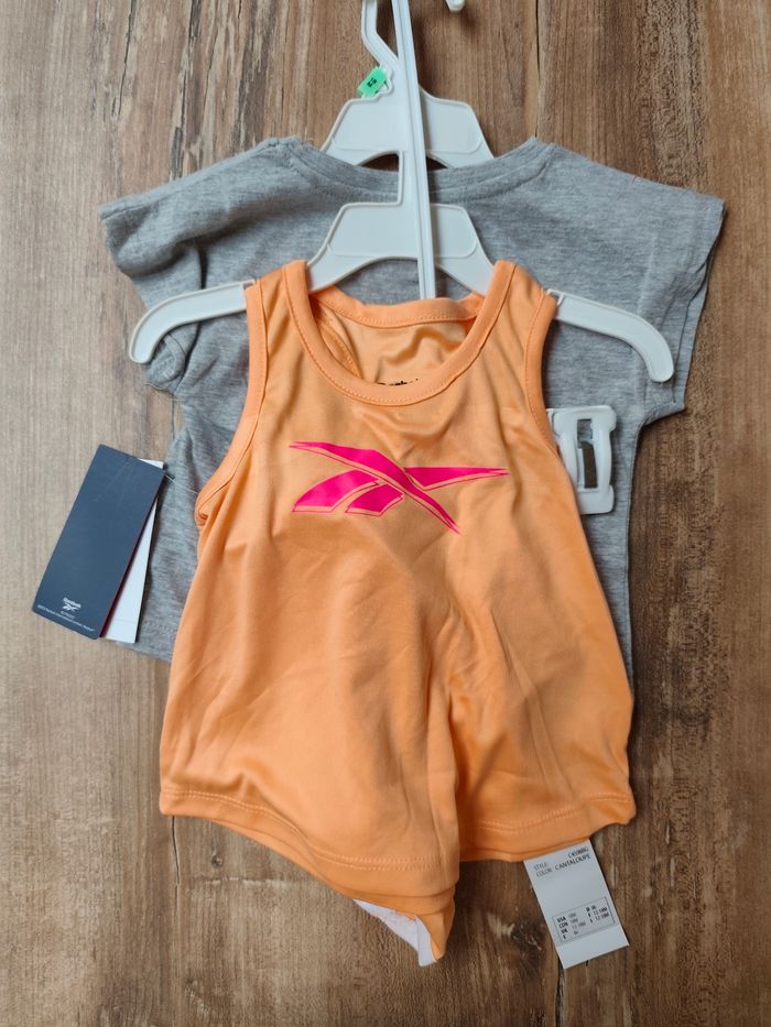 Ensemble Reebok fille neuf avec étiquettes, coloris Cantaloupe (orange pastel, gris chiné, rose).