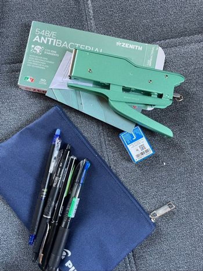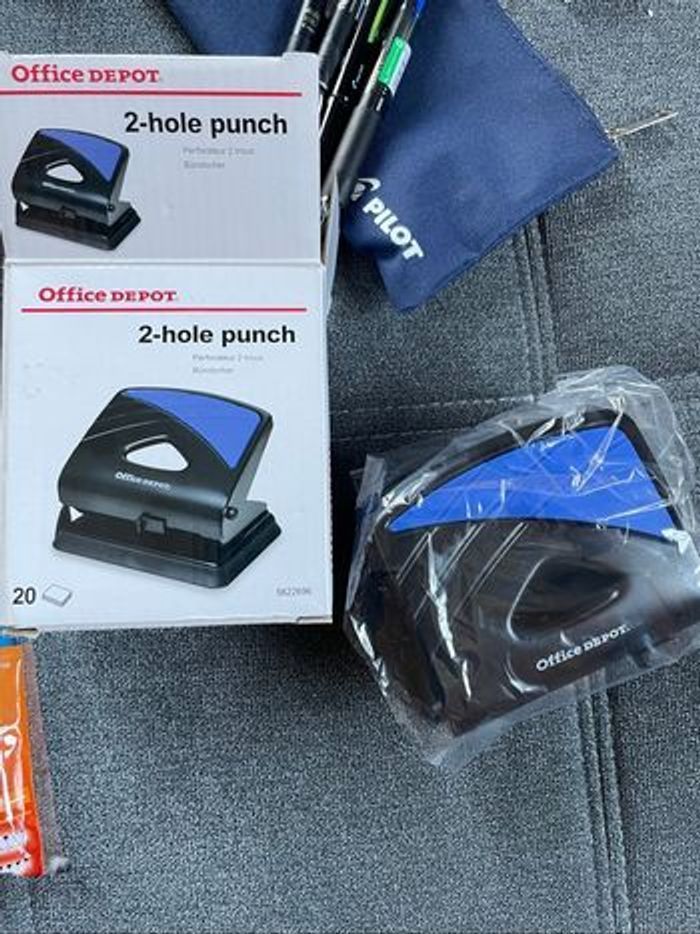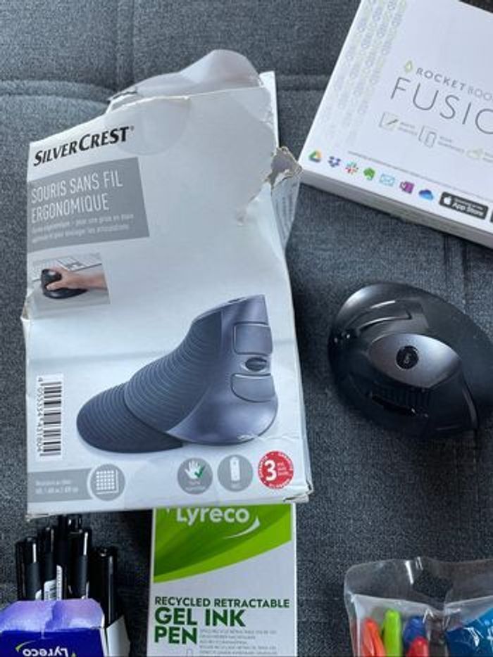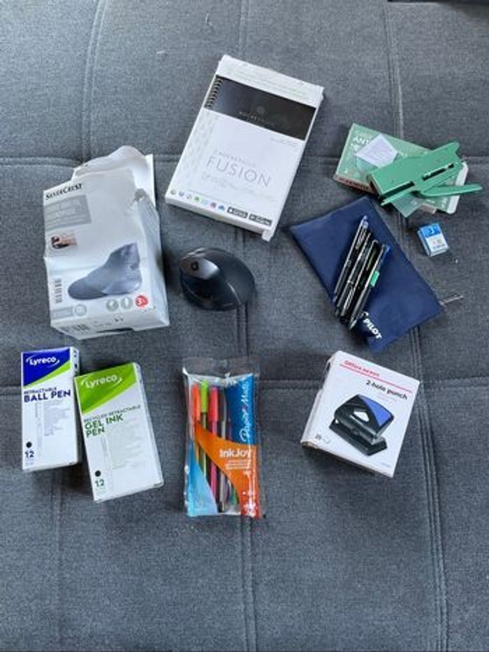 Une souris sans fil économique, utilisé une seule fois un Rocket book fusion neuf un perforateur de bureau 2 trous neuf, une agrafeuse zénith professionnelle en metal neuve avec ses agrafes et 38 stylos neufs. Bien sûr avec une petite trousse neuve. Possibilité d’avoir plus de photos sur demande et de renseignements complémentaires je peux étudier une offre raisonnable