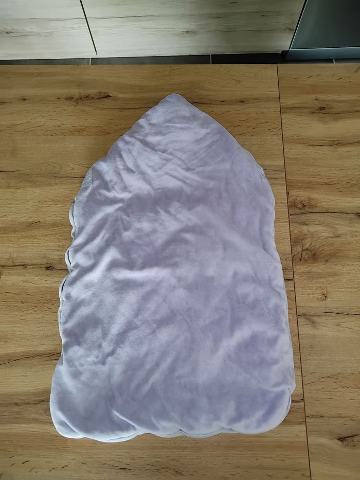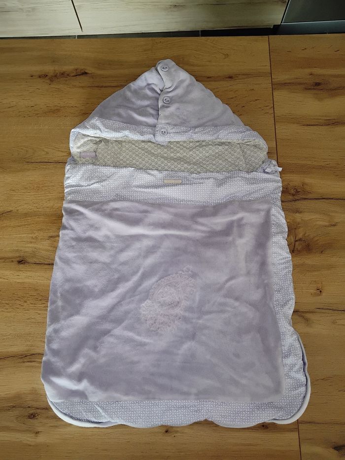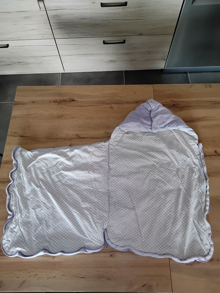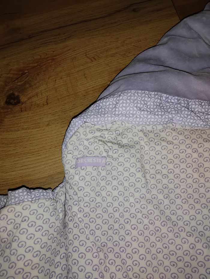 Nid d'ange taille unique violet pâle et bleu, marque orchestra. Fermeture éclair sur le côté. Hauteur totale 70 cm donc convient entre 0 et 3 mois.