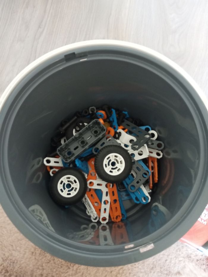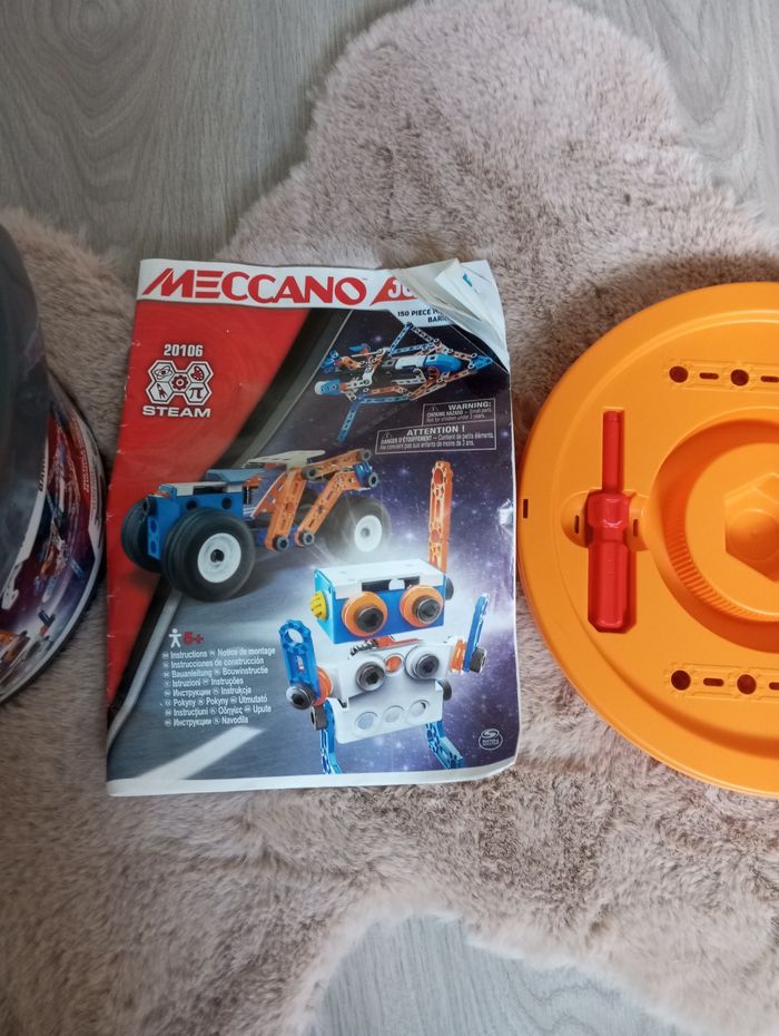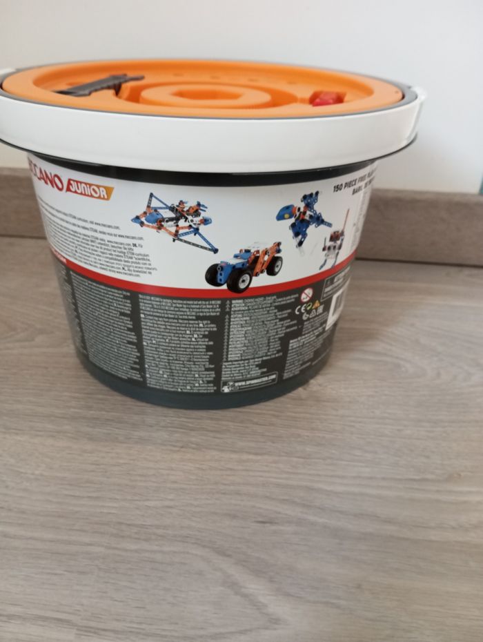 Baril meccano junior, 150 pièces pour assembler plusieurs modèles. Notice à l'intérieur. Il est complet. Mon fils a très peu joué avec.