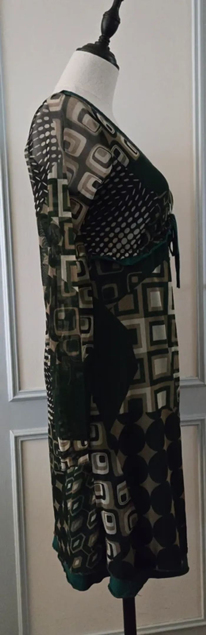Robe taille 38, doublée, manches longues. dans les tons vert / beige. Longueur: 80cm