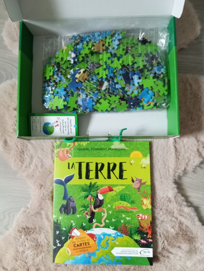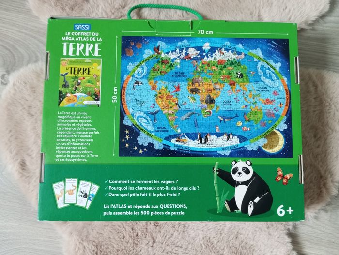 Le coffret du méga atlas de la terre. Comprenant un puzzle de 500 pièces, 40 cartes questions réponses et un atlas. 6 ans et plus. Il est complet et quasi neuf. Mon fils n'a jamais voulu s'en servir.