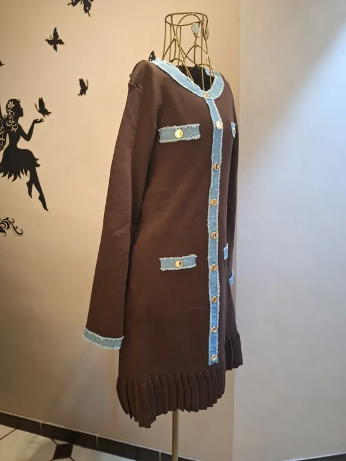 Robe pull marron - liseré en jeans - plissée au bas de la robe - longueur 84 cm - coupe cintrée - matière douce & assez épaisse - taille unique idéale pour les tailles S & M ou 36 & 38 - état sans défaut - Caractéristiques : Col rond, Boutons décoratifs, Poches plaquées, Ourlet plissé #robepull #robepullmarron #robepulljeans #robepullchic