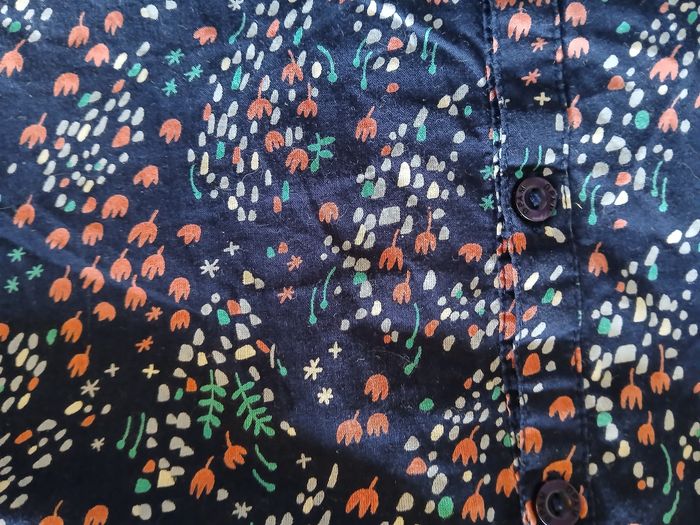 Chemisier bleu marine a motifs de fleurs oranges, verts et blancs. Manches longues. Boutonné de haut en bas Marque Du Pareil au Meme Taille 4 ans / 104 cm Très bon état