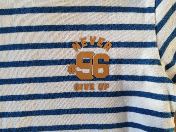 T-shirt a manches longues marinière, blanc rayé bleu. Marqué "Never Give Up" sur la poitrine. Marque Okaidi. Taille 3 ans / 98 cm Très bon état