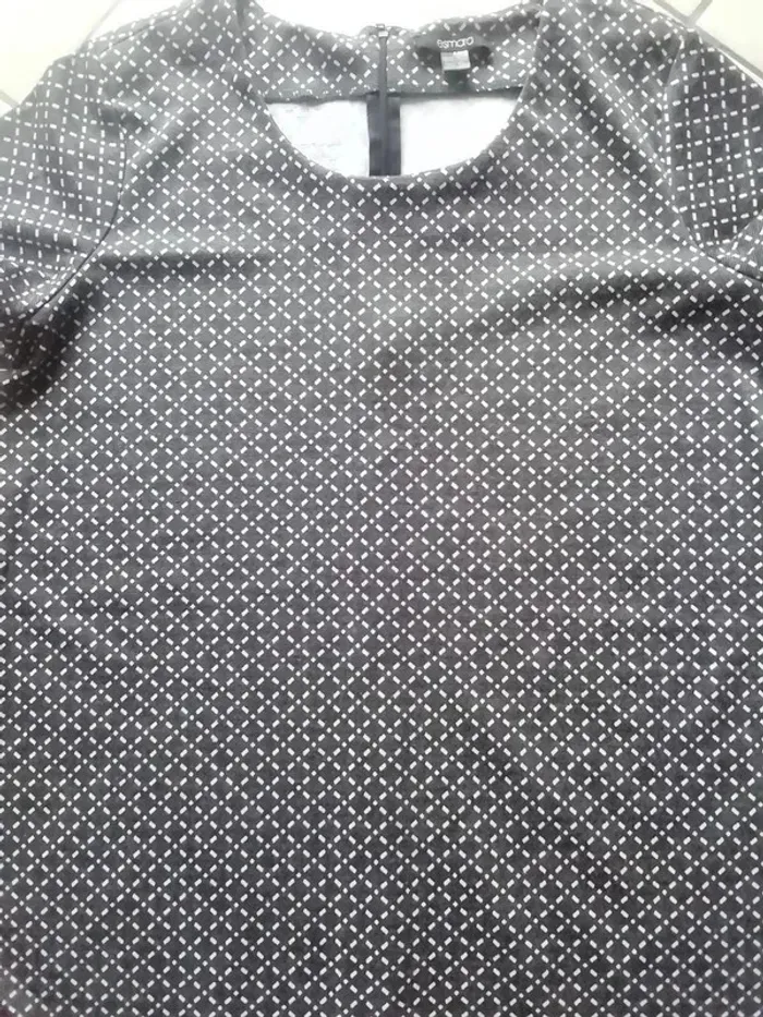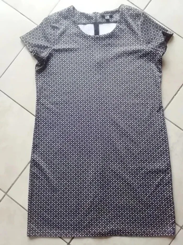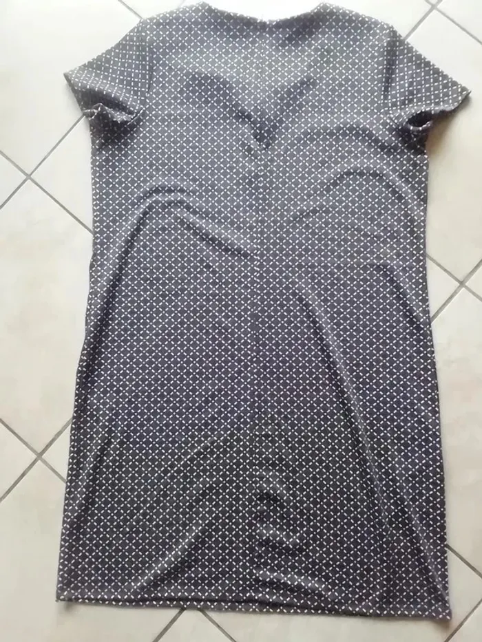 COULEUR GRIS FONCE A PETITS MOTIFS LOSAGES-CARRES BLANC. MATIÈRE IDÉALE AUTOMNE HIVER OU AUTRE SI PORTÉE SANS RIEN DESSOUS. TRES JOLIE MODEL, TRÈS ACTUEL. BELLE LONGUEUR : ENV 95CM. TRES CLASSE PORTÉE. TAILLE NOTÉE : 46/48 MAIS POUR UN BON CONFORT PLUTOT 46. (largeur aisselle à l autre à plat devant: env 55-6cm).