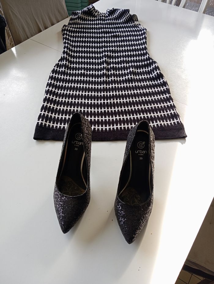 Robe sans étiquette taille 38 très bon état + Chaussures à Talons pointure 39 Marque Gémo vendu avec la demi semelle protection légères traces d'usure sur le dessus de la chaussure mais ne se voit pas à part de zoomer au maximum Possibilité de vendre la robe à l'unité à 10 € et également les chaussures 10 € l'unité Sinon Lot 15 €