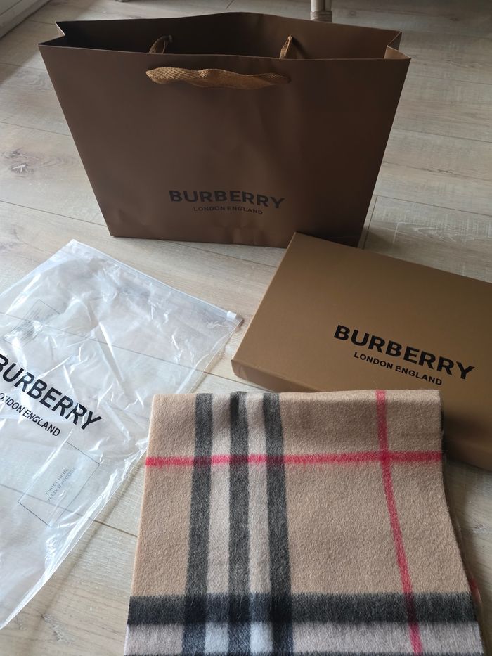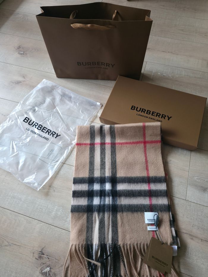 Écharpe Burberry Classique en Cachemire - État Neuf avec Packaging Magnifique écharpe Burberry authentique arborant l'emblématique motif "Check" (carreaux) dans les tons iconiques : camel, noir, blanc et rouge. Un accessoire intemporel, d'une douceur exceptionnelle, parfait pour l'hiver ou pour offrir. Détails de l'article : • Matière : 100% Cachemire (toucher ultra doux et chaud). . Motif: Vintage Check Burberry. • Etat: Neuf, jamais portée, avec toutes les étiquettes encore attachées. • Packaging complet inclus : • Le sac de transport Burberry. • La boite cadeau rigide. • Le pochon de protection transparent. Envoi rapide sous 24h ✈️