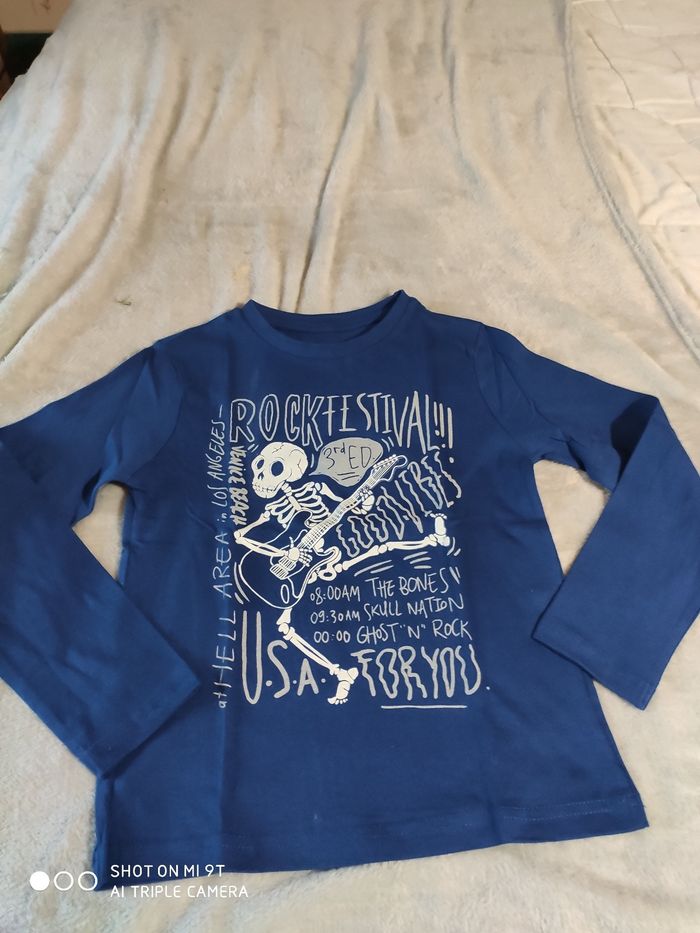 Tee shirt manches longues garçon taille 8 ans en très bon état pas de tâches ni trous. Couleur bleu foncé avec des graffitis sur le devant de chez Kiabi. Taille correctement et porté par un seul enfant sur une saison.