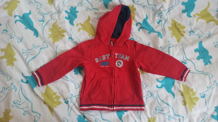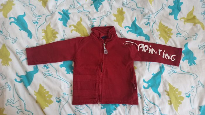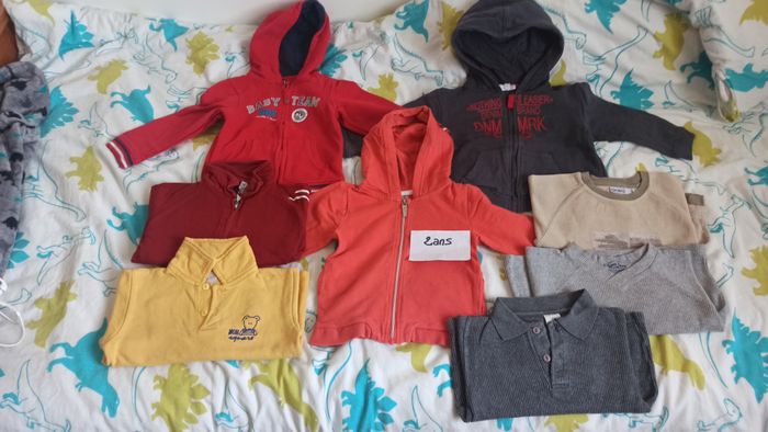Lot de 5 sweats 2 ans + 3 t-shirts épais 2 ans. Marques : Orchestra, Okaidi, Terre de marins, Super U, autres Bon état général. Le rouge sur la 5ème photo a la peinture écaillée au niveau de la tirette de la fermeture éclair