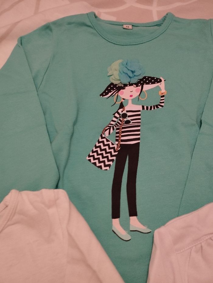 - un vert avec un dessin de fille sur le devant, motif en relief au niveau du chapeau
