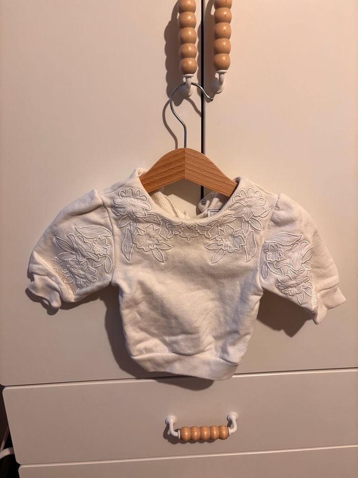 Pull blanc à motifs fleuries travaillés tartine et chocolat 3 mois.