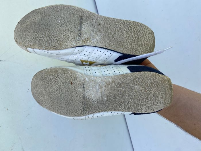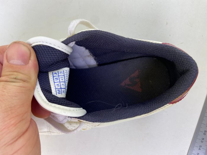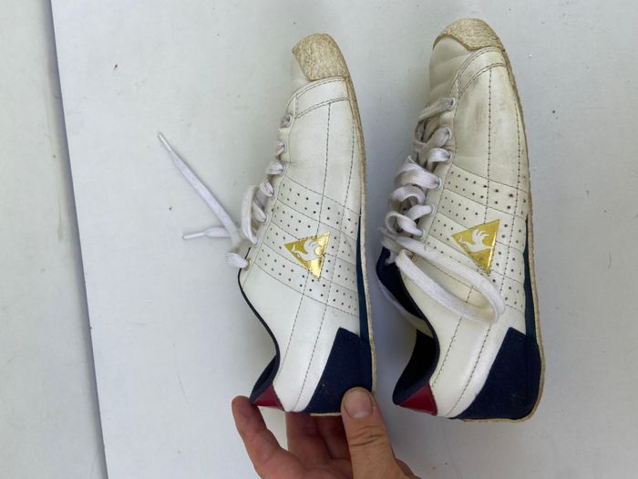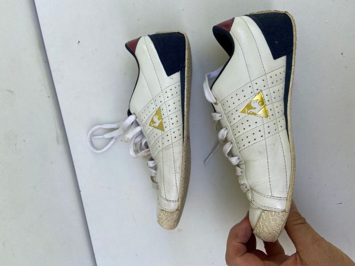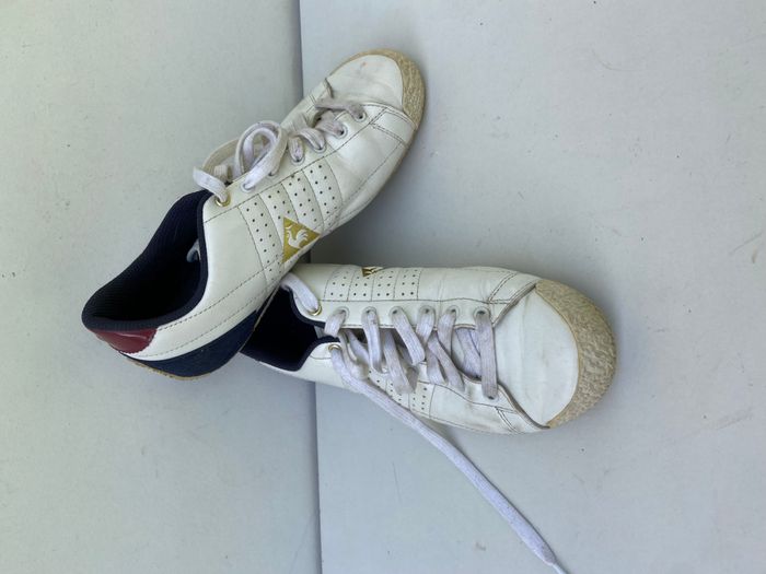 Je vends cette paire de baskets Le Coq Sportif originales, au style rétro et élégant. Elles arborent les couleurs classiques de la marque (blanc, bleu marine et rouge) avec des détails dorés sur le logo. Caractéristiques principales : Marque : Le Coq Sportif Modèle : Silhouette "Court" fine et légère (Art n° 1512004) Pointure : 36 EUR (3 UK / 4.5 US / 23 cm) Couleurs : Cuir blanc, talon en suède bleu marine, finitions rouge verni et logos dorés. État de l'article : État général : Bon état (portées mais bien entretenues). Détails : Le cuir est souple et les logos dorés sont parfaitement intacts. À noter une légère patine naturelle sur la semelle en gomme et quelques marques d'usage normal sur le cuir blanc (voir photos). Intérieur : Propre, doublure bleu marine en excellent état.