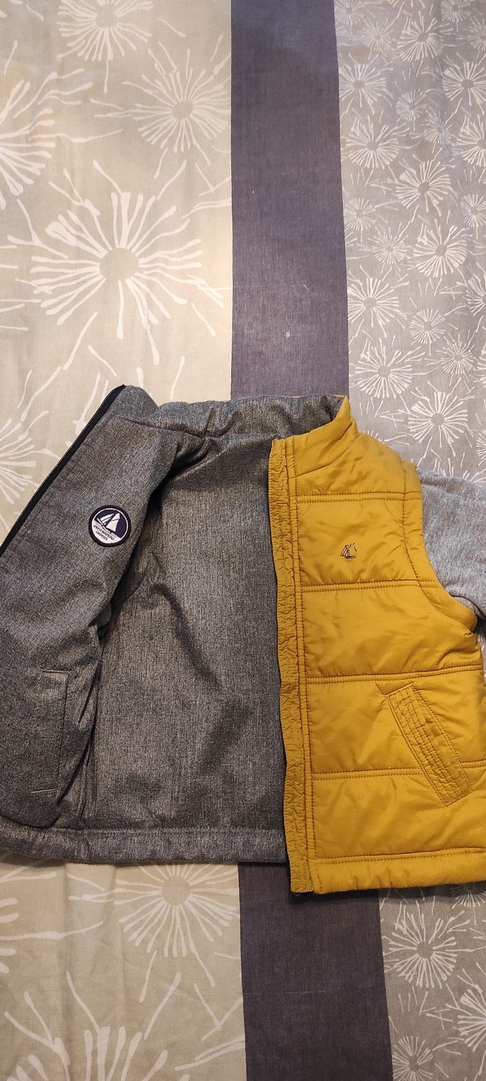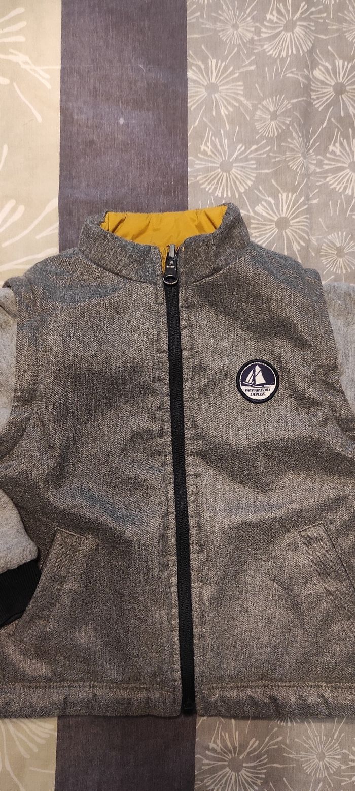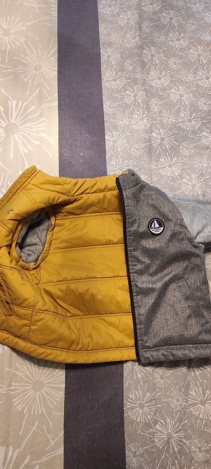 Veste réversible Petit Bateau Un côté jaune : doudoune (sauf les manches) Un côté gris : veste effet matelassé Fermeture éclair Poches avant (des deux côtés) Très bon état (un peu plus porté côté doudoune ) et parfait état côté gris chiné Pensez aux lots : réductions activées