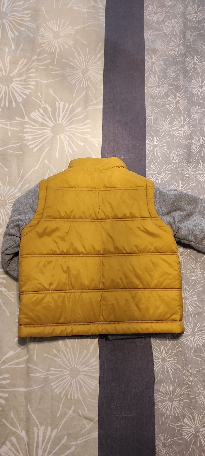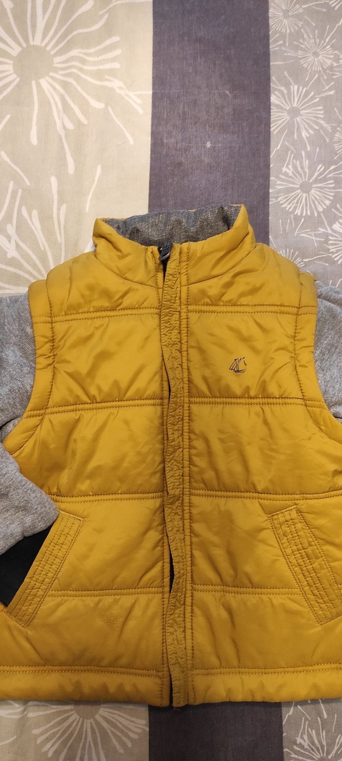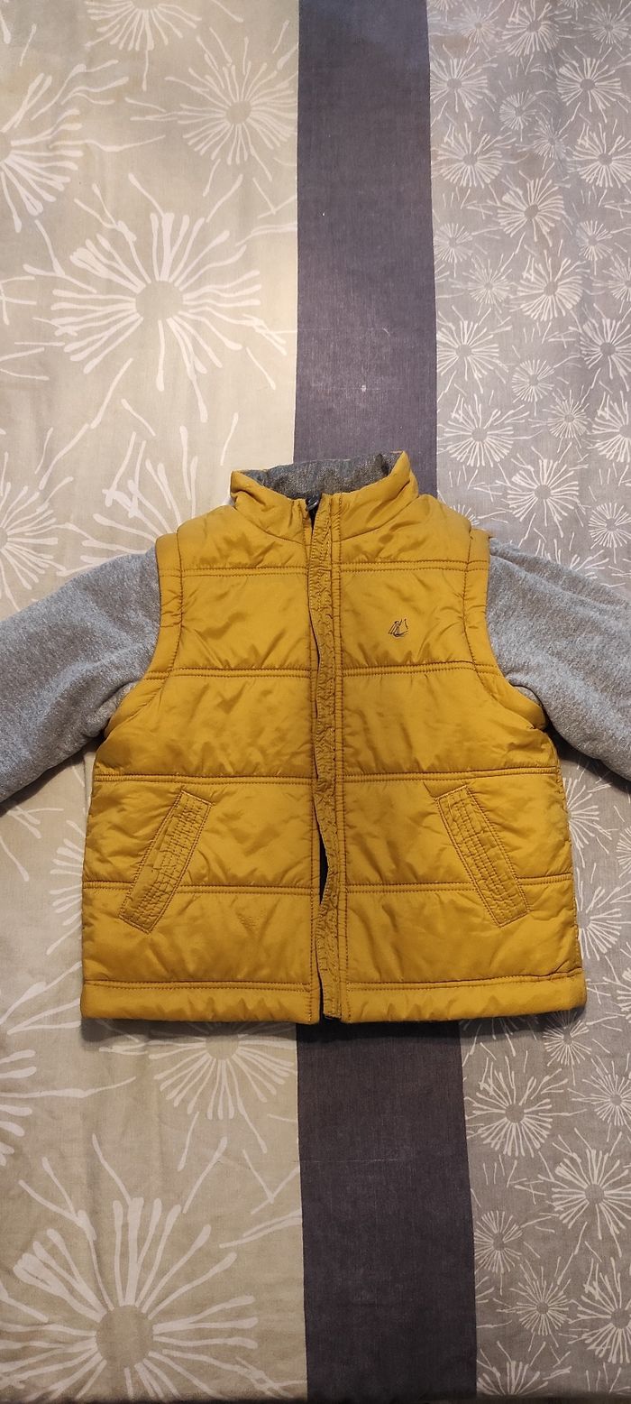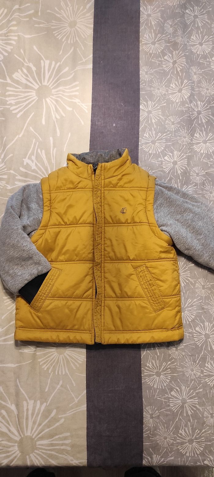 Veste réversible Petit Bateau Un côté jaune : doudoune (sauf les manches) Un côté gris : veste effet matelassé Fermeture éclair Poches avant (des deux côtés) Très bon état (un peu plus porté côté doudoune ) et parfait état côté gris chiné Pensez aux lots : réductions activées
