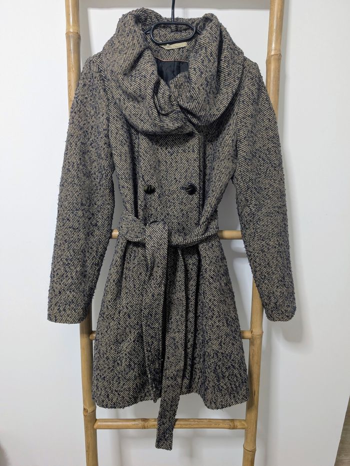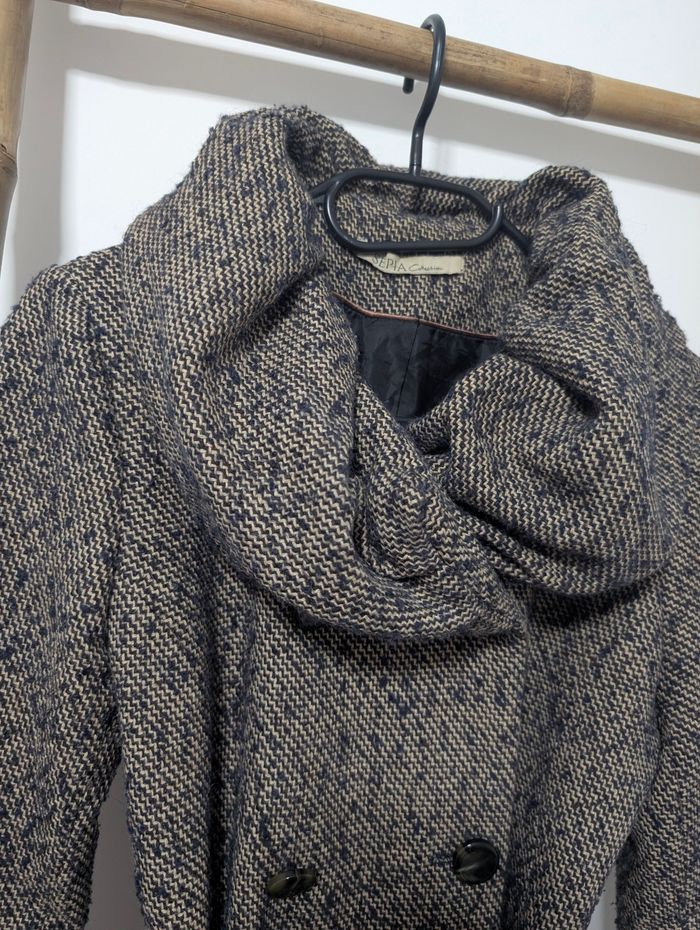 Manteau Sepia Collection, modèle Adara, élégant et intemporel. Tissu épais avec 20 % de laine, idéal pour l’automne et l’hiver. Coupe féminine avec ceinture à nouer, double boutonnage et col large. ✨ État : très bon état ✔️ Aucun trou, aucune tache ✔️ Doublure propre ✔️ Boutons et ceinture impeccables 📏 Taille : 36 🔹 Convient à un 36, peut convenir à un petit 38 selon le porté 🧵 Composition : 20 % laine 50 % acrylique 25 % polyester Doublure 100 % polyester 🎨 Couleur : gris / beige chiné, facile à assortir 💡 Parfait pour un style chic, classique, bureau ou quotidien