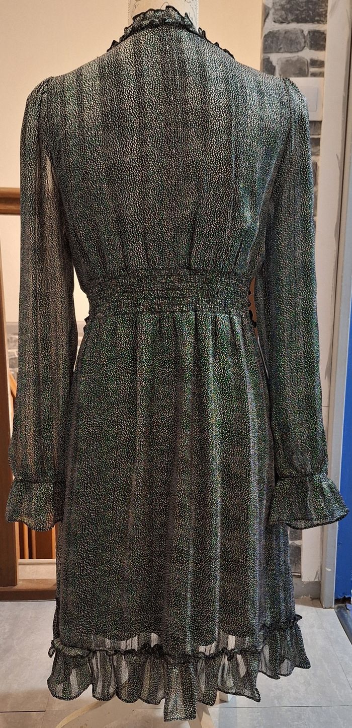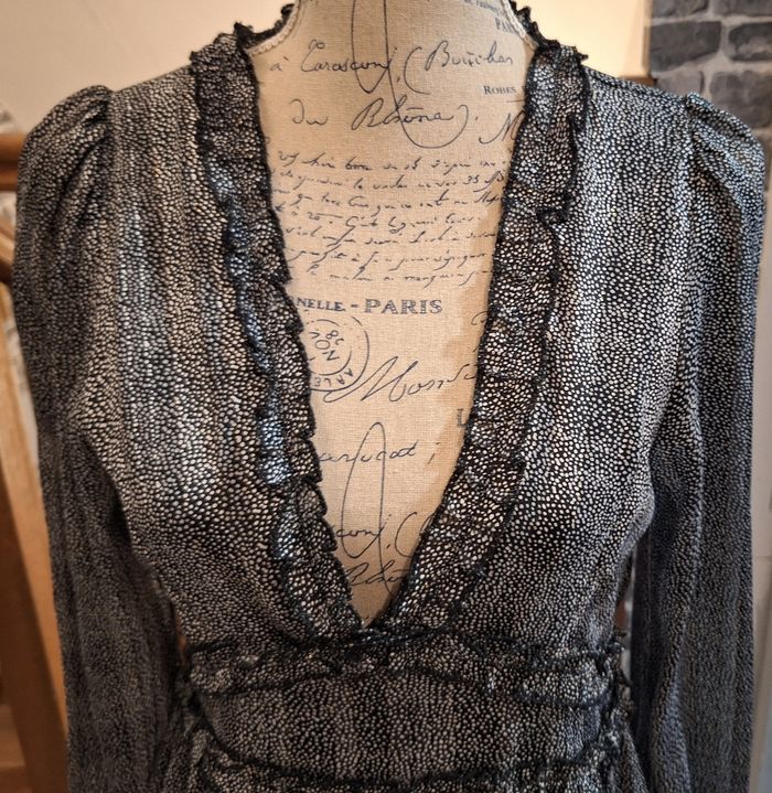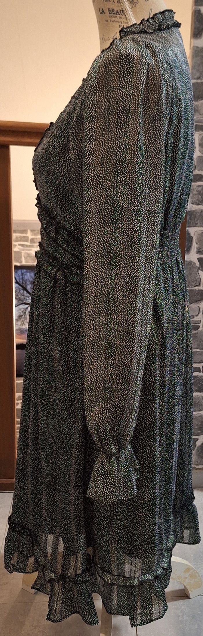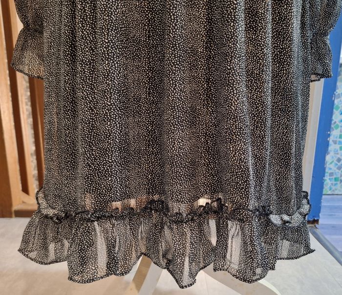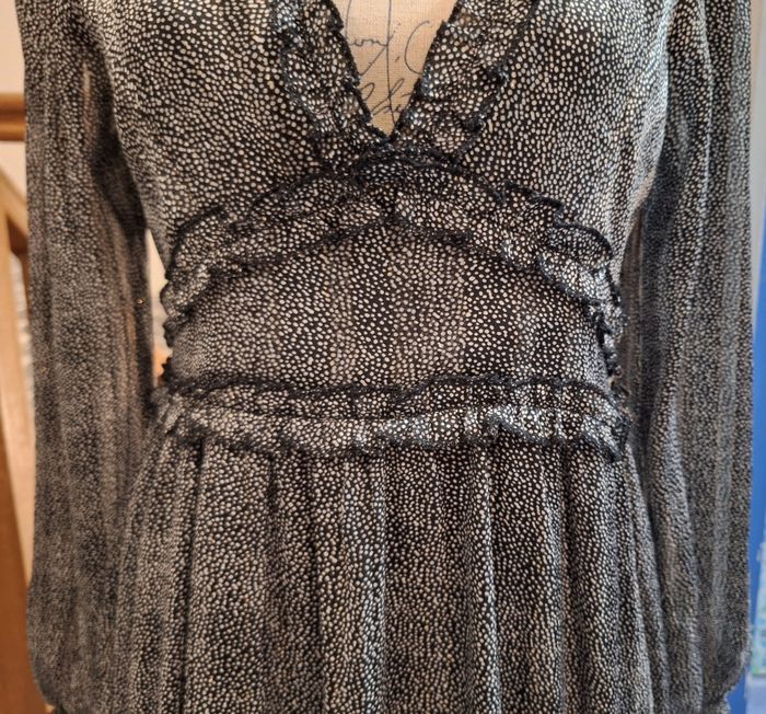 Hauteur 96 cm. A porter avec un top car le col en V est fort ouvert. Petits volants au col, sous la poitrine, à la ceinture et à la base. Poignets élastiqués. Doublée, mais pas aux manches. Noire imprimée de petits points blancs avec de jolis reflets selon l'éclairage.