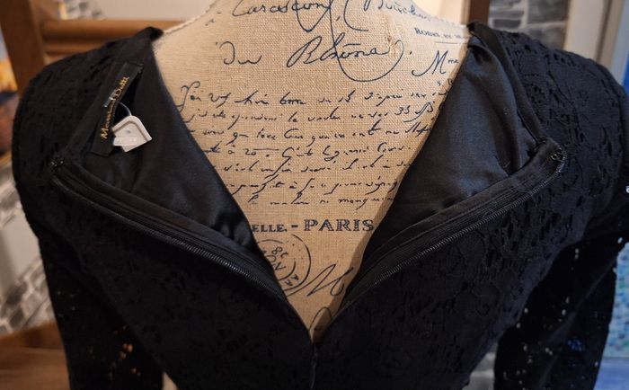 Toute en dentelle ajourée sur une doublure satinée. Manches 3/4 transparentes non doublées. Zippée au dos + une agrafe. Hauteur 82 cm. En polyester et élasthanne.