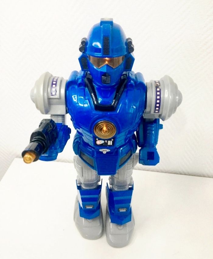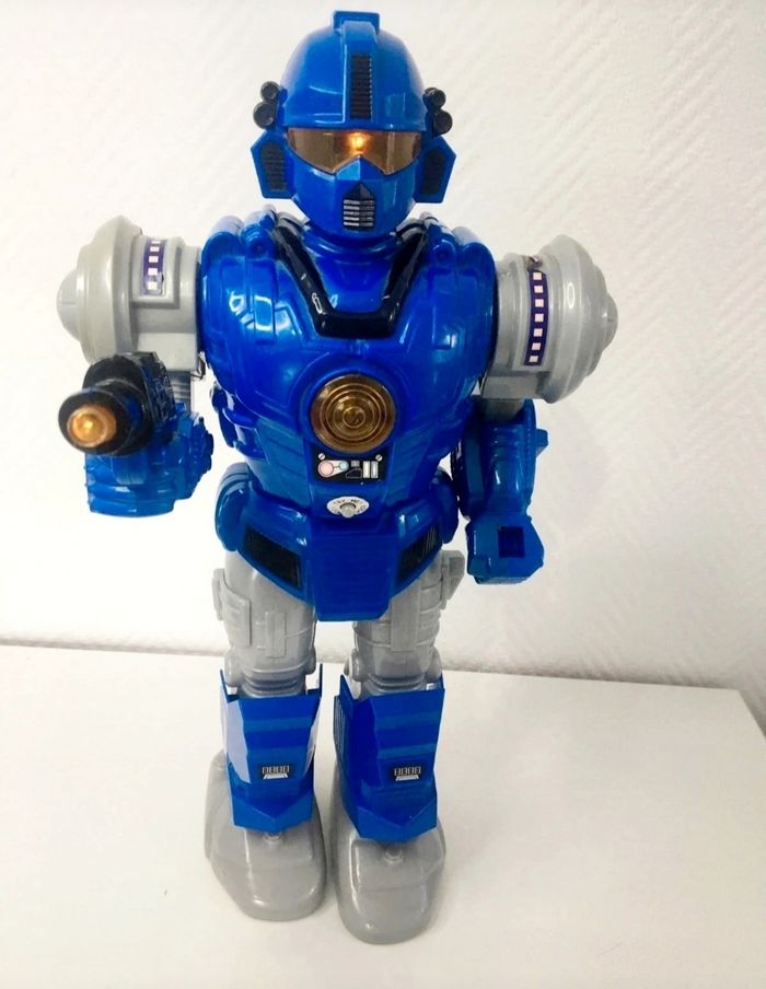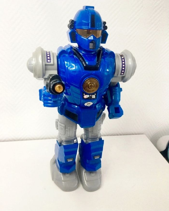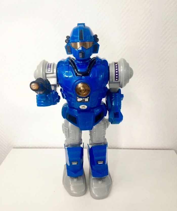 Robot aventure vintage de la marque Feng Yuan, un grand robot destructeur bleu. - Type de produit : Robot jouet - Marque : Feng Yuan - Gamme : Robot d'aventure - Fonctionnalités : Lumière et son - Âge recommandé : 7 ans et + En bon état Son à réparer Il mesure 43 cm Un jouet vintage parfait pour les amateurs de robots !