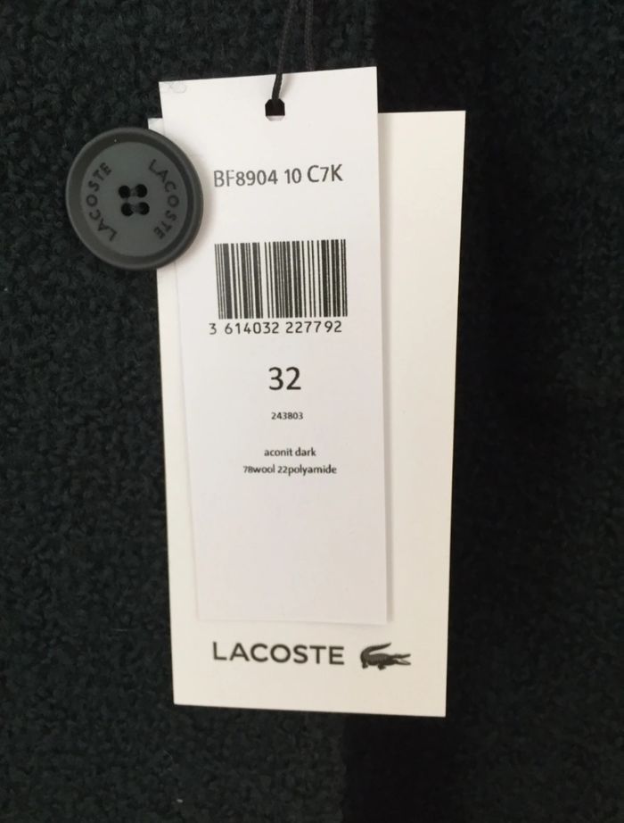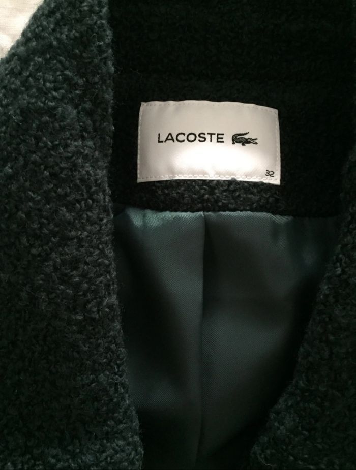 Manteau long, vert foncé, croisé maille bouclette, marque lacoste Neuf Ceinture Taille 32 mais taille taille très grand convient pour un 34 et même un 36