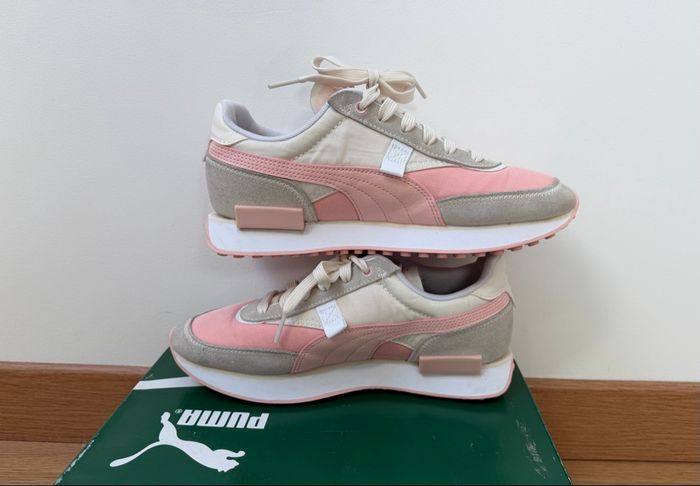 PUMA FUTURE RIDER DISPLACED taille 38.5 Portées quelques fois mais très bon état Juste un petit défaut sur le haut d’une chaussure voir photo je les ai reçu avec cette petite tache