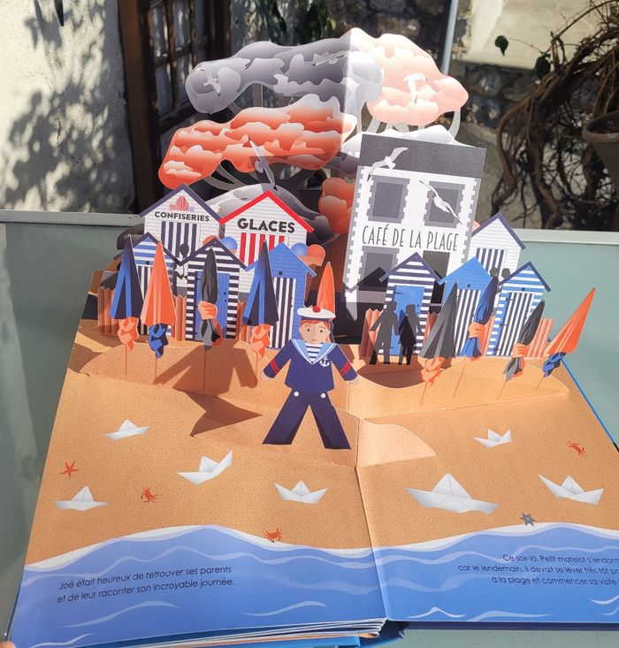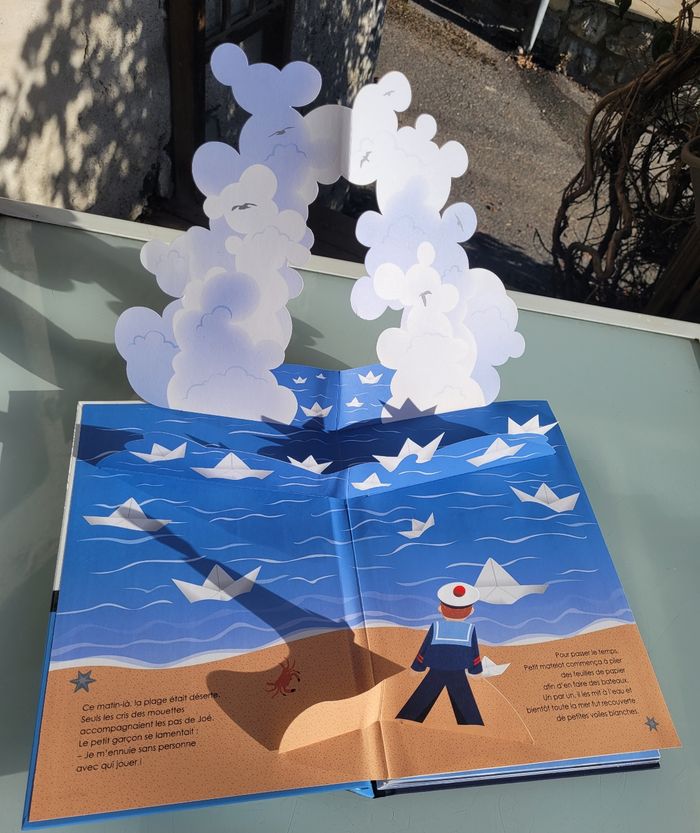 MATELOT À L'EAU ! LIVRE POP-UP Ce matin-là, la plage est déserte. Seuls les cris des mouettes accompagnent les pas de Joé. Pour passer le temps, Petit matelot commence à plier des feuilles de papier pour en faire des bateaux. Un par un, il les met à l’eau et bientôt toute la mer est recouverte de petites voiles blanches... A bord d’un bateau en papier, le lecteur embarque pour un voyage imaginaire aux côtés de Joé. Voguer sur les flots à la rencontre d’un monstre marin, d’un poisson lune, d’icebergs géants… le lecteur découvrira avec Petit matelot ce qui ce cache derrière l’horizon ! Un livre poétique, qui sur chaque double page, présente un pop up époustouflant. En très bon état Mes autres livres pop-up : #popupmooglou Mes autres livres enfants : #livreenfantmooglou