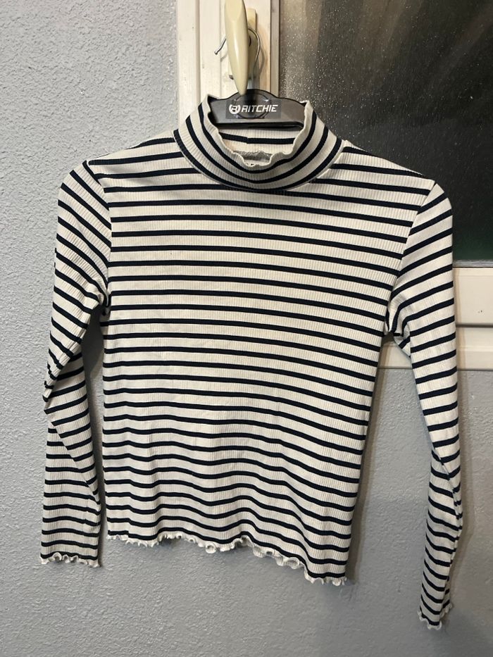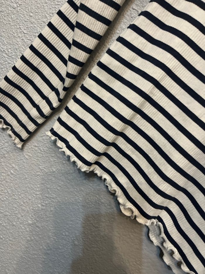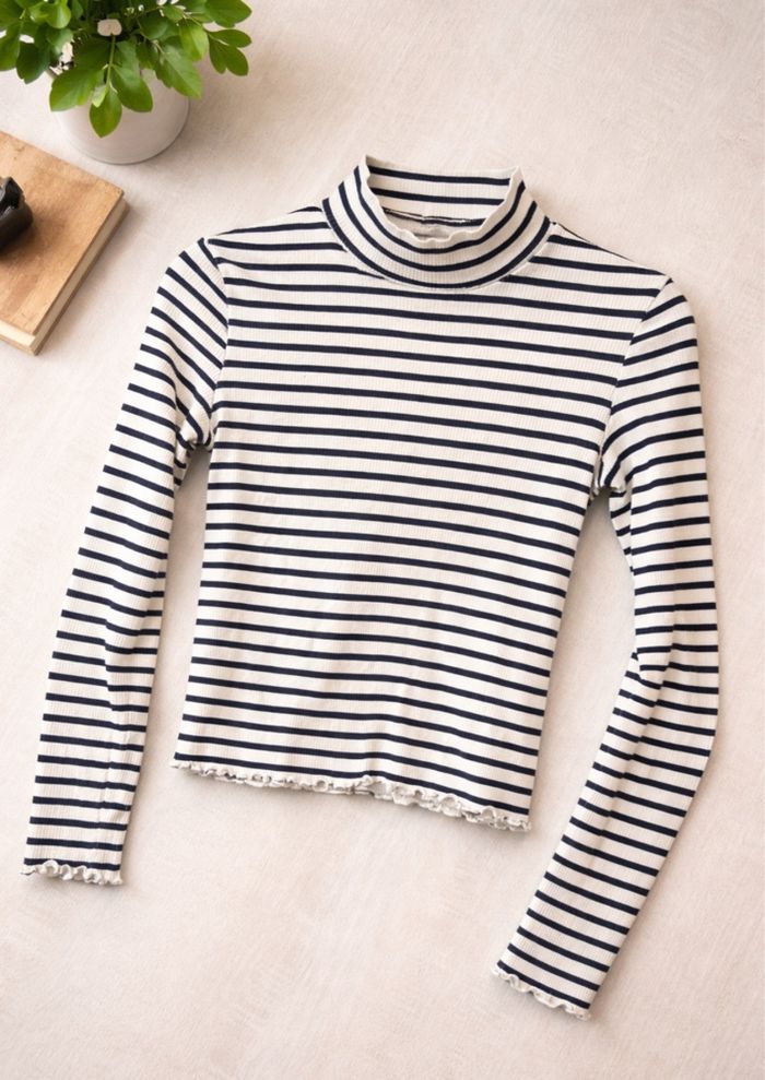 Haut blanc à rayures bleu marine, matière côtelée extensible, avec col montant et finitions ondulées au bas et aux manches. Coupe ajustée, confortable et très tendance.