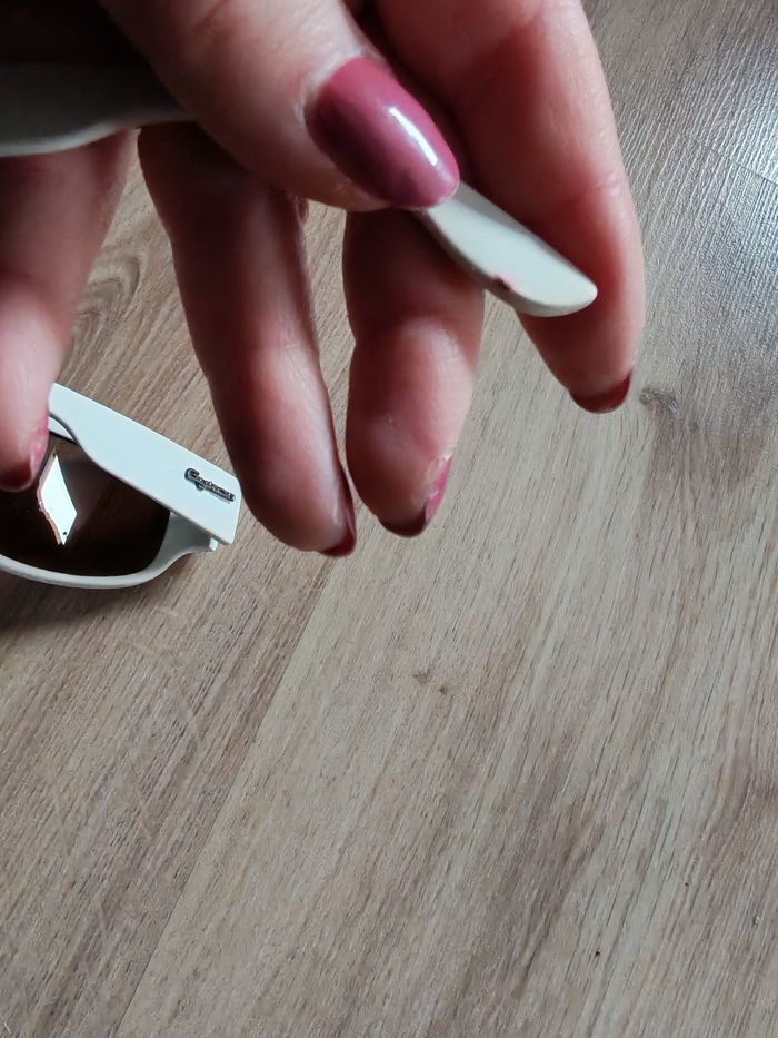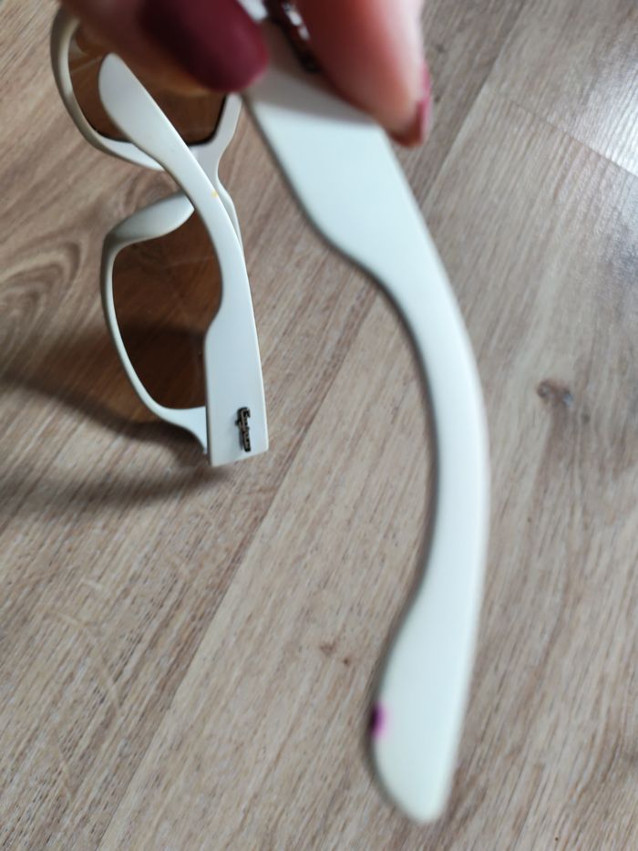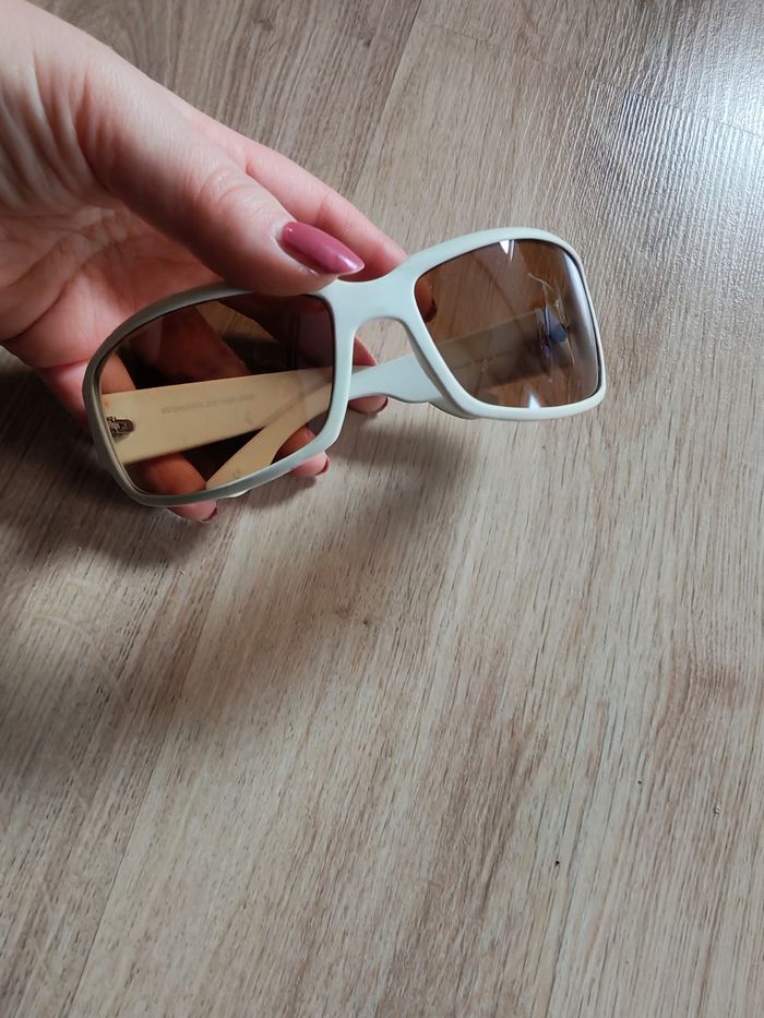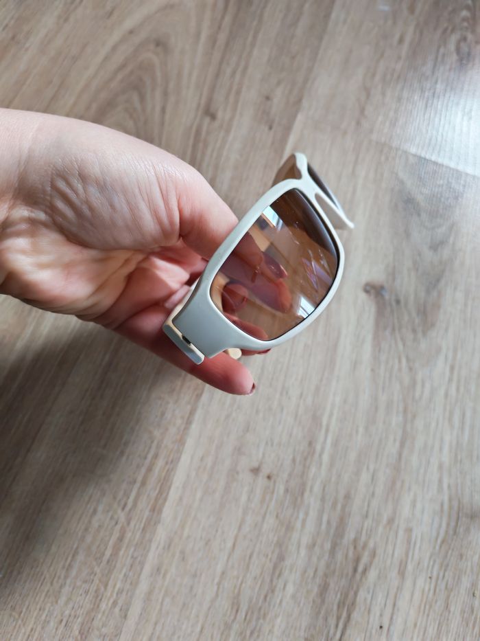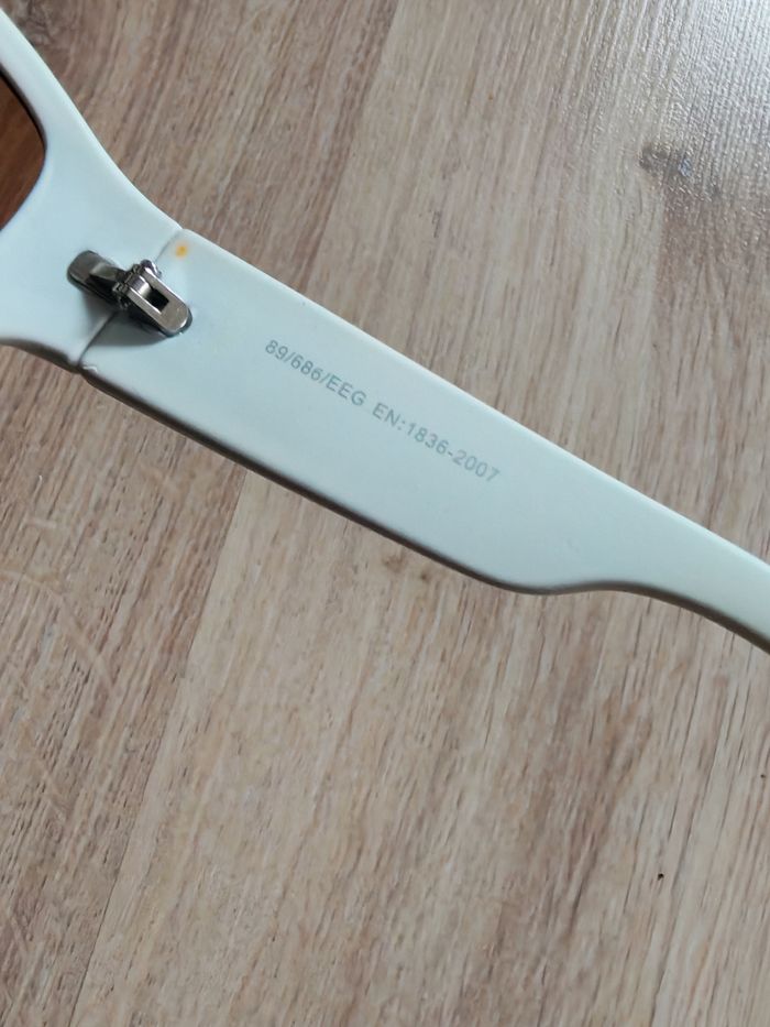 Lunettes de soleil Gyron blanc cat.3, en plastique, en bon état général, comporte des traces de stylo, quelques rayures sur les verres à nuances marrons, forme allongée réctanguaire. Dimensions : Distance entre les deux vices : 13,5 cm Largeur de verre : 6,5 cm Hauteur de verre : 4 cm Distance entre les verres : 11 mm Longueur des branches : 11,5 cm Poids : 28g