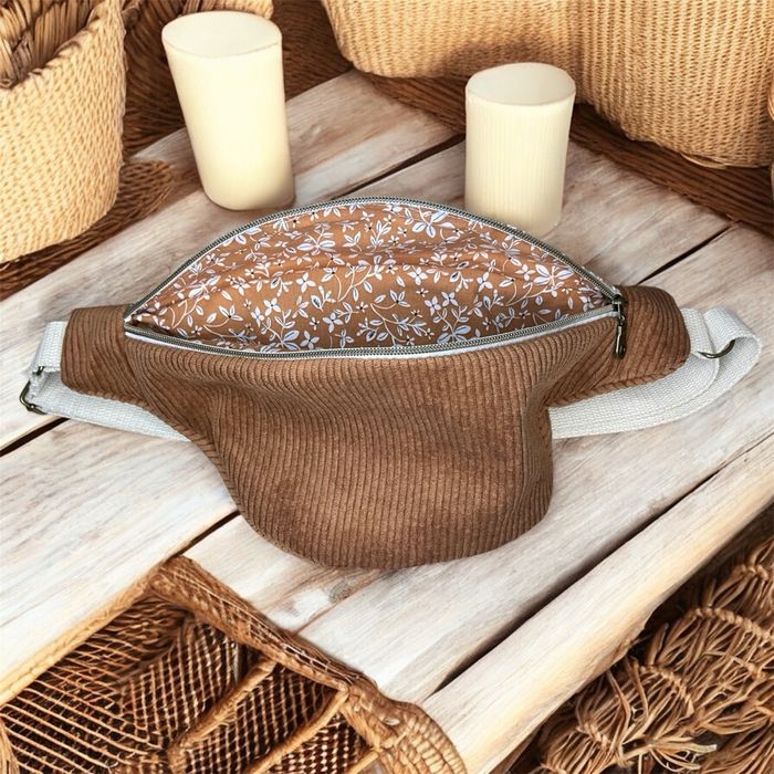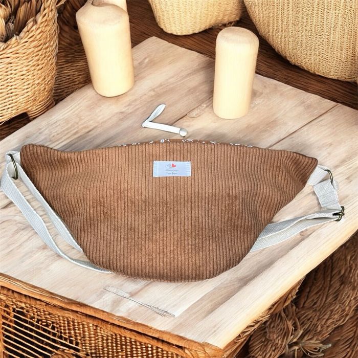 Sac banane en bandoulière velours côtelé marron et fleurs assorties