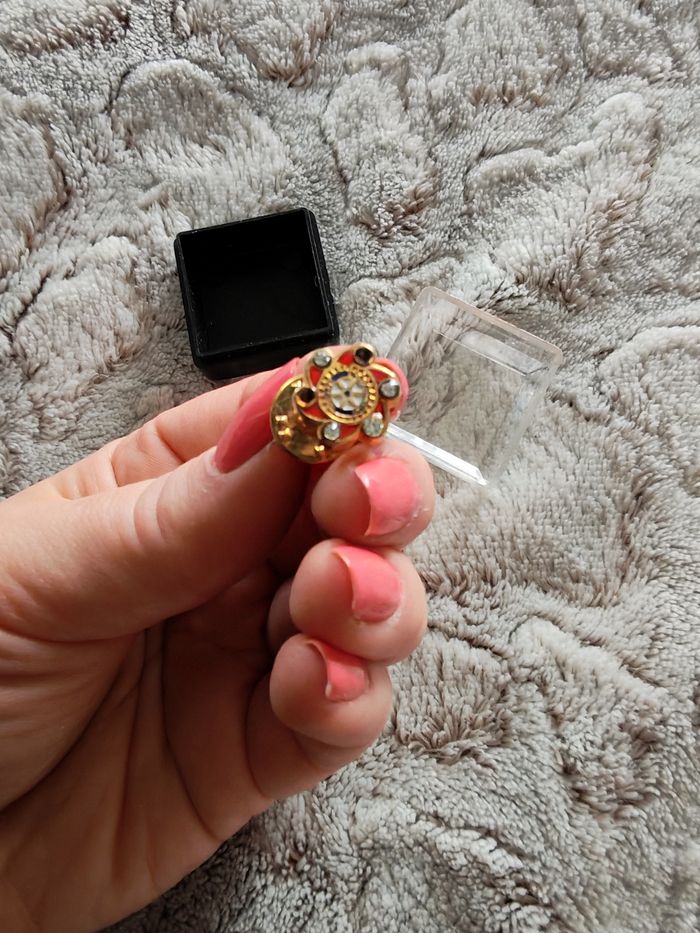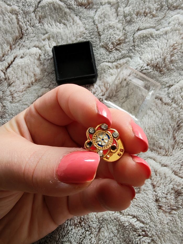 Pin's ou épinglette Rotary International, le fermoir signé Ballou Rag D. Broche en métal doré et des petites perres/strass, il en manque 2 sur 6, en bon état général. Pin's vintage. Dimensions : Hauteur : 10 mm Diamètre : 12 mm Poids : 2g