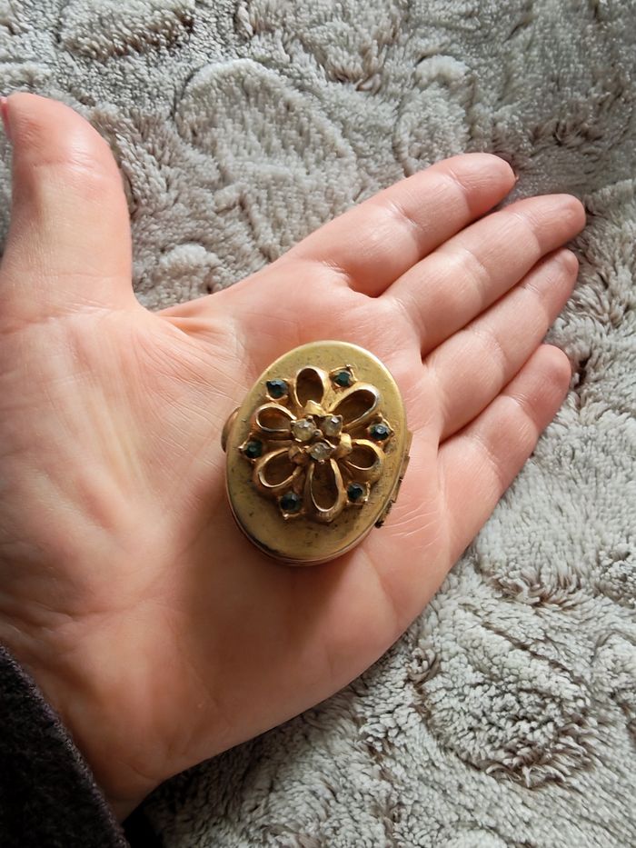 Petite boîte à souvenir en métal doré vintage dessus fleur en pièrres ( à nettoyer car térnies). Petite boîte ovale vintage en alliage de couleur dorée, mais la couleur argentée est apparente par endroit. Boîte à souvenirs ou petites boucles d'oreilles type clous, l'intérieur est oxydé. Dimensions : Hauteur 2 cm Longueur : 3,5 cm Largeur : 2,8 cm Poids : 21g