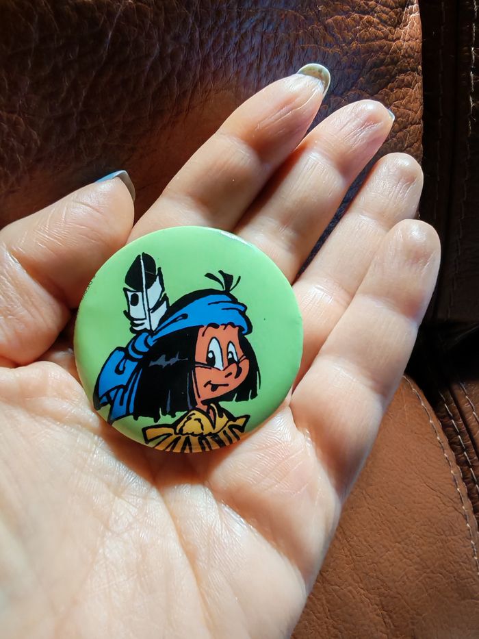 Badge de BD Yakari Le Lombard 2010 Derib - Job, n très bon état général, un petit défaut de qualité, pliure sur la partie métallique qui recouvre le badge en plastique, diamètre 42mm.