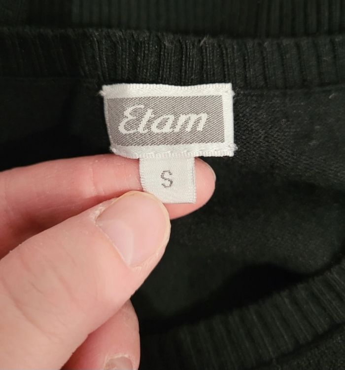 Pull court Etam, taille S. Manches 3/4. Excellent état. 68% viscose, 32% nylon. Aisselle à aisselle : 39cm Épaule à épaule : 33cm Longueur : 48cm Envoi rapide. #reductionsurleslots #pulletam