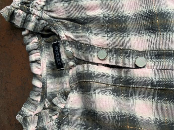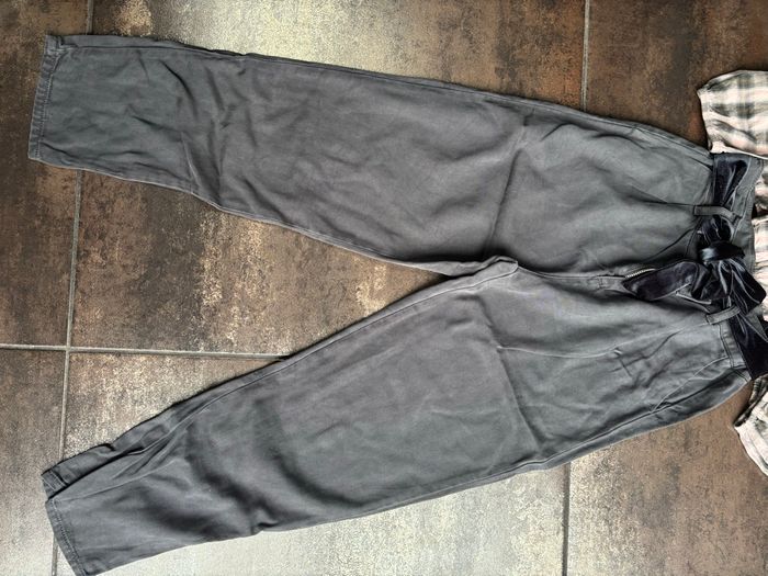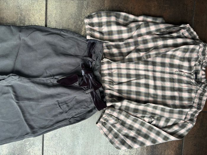 Collection récente Excellent état Pantalon fluide gris avec ceinture et blouse écossaise avec fils dorés