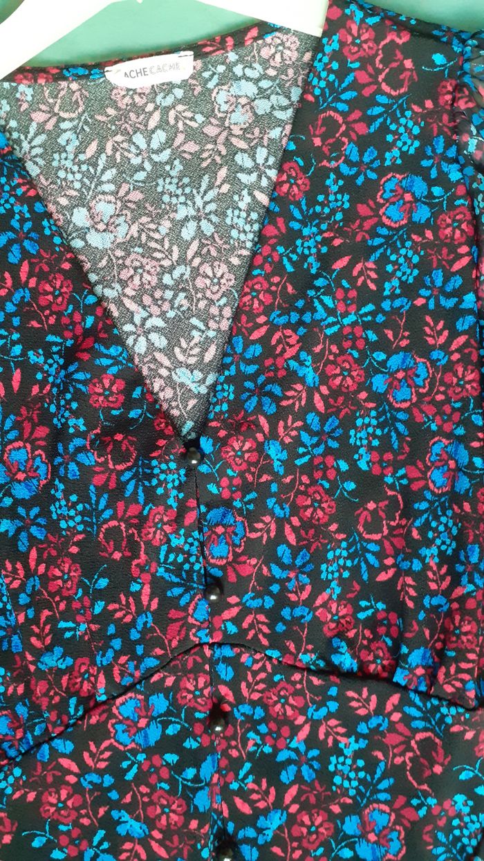 Vends un top manches longues en voile terminées par un élastique, 95 % polyester, 5 % élasthanne, cintré sous la poitrine, petits boutons devant, couleur noir avec petites fleurs rouge et bleu, marque Cache-Cache, taille 38. Longueur de l'épaule à la base : 55 cm Largeur aisselle à aisselle : 43 cm.